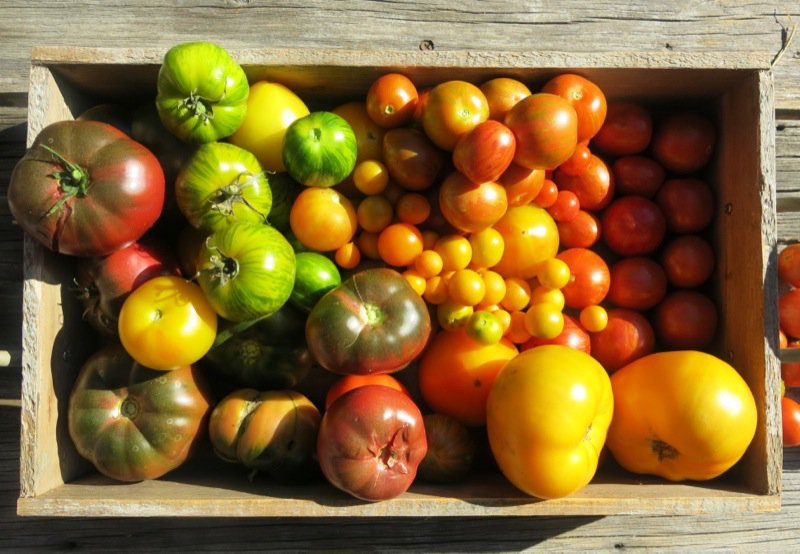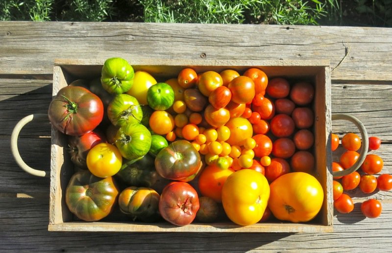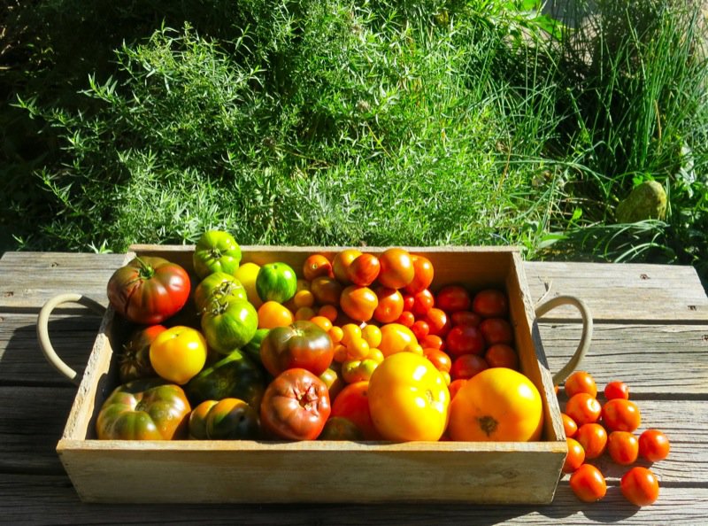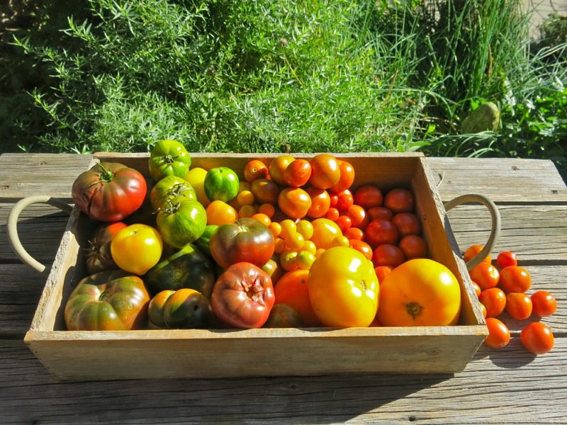 I neglected my tomatoes this year due to illness in the family and my own personal inability to get help with the regular garden maintenance. I hope that improves next year as I love my tomatoes. My best harvest was the summer of 2011. I had no idea how fortunate I was that year to acquire all of the varieties I was looking for and then for them to flourish as they did. If you are in zone three and want to learn more about what to plant, read that article. Above, the Stupice are to the right of the basket on the bench. The cherry tomatoes are not identified inside of the basket, but all others are.