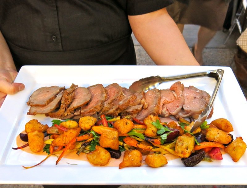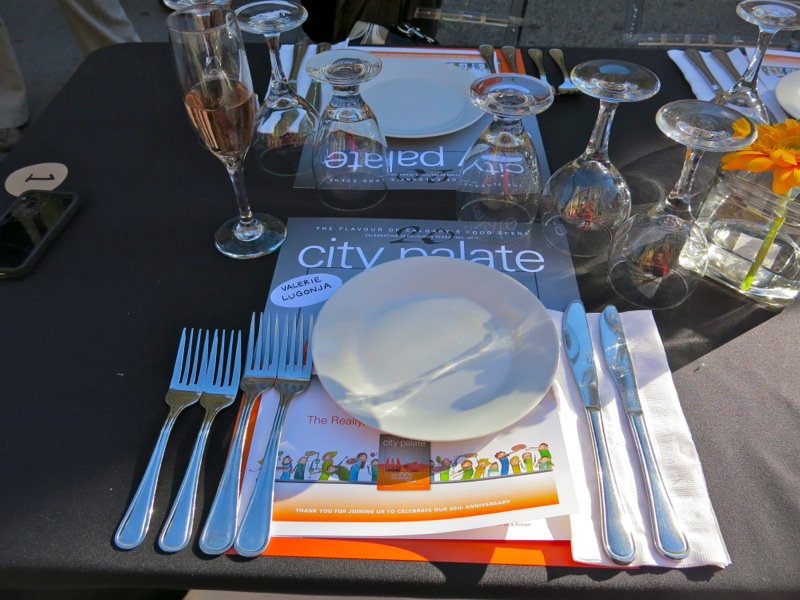 I attended on behalf of Alberta Culinary Tourism Alliance as I am one of the Directors. I would have been there, anyway. The profit from this $150 dollar a plate dinner went to the Red Cross Flood Relief Fund. My table partner, Karlynn from The Kitchen Magpie accompanied me to write about the event. Our team was seated at table one…. waaayyy down there by the white tent at the other end. The lucite chairs sparkled in the late afternoon sun. The black tablecloth with white linen napkins provided the perfect reserved and formal foil for the street party while cheery Gerber daisies grinned a welcome above the bright orange City Palate placemats. Sparkling rose in hand upon registration, we purposefully arrived in time to savour the setting.