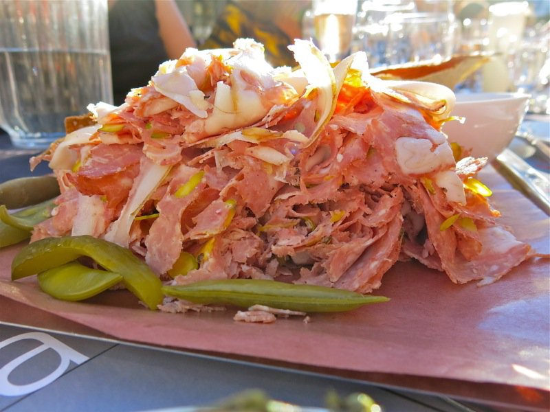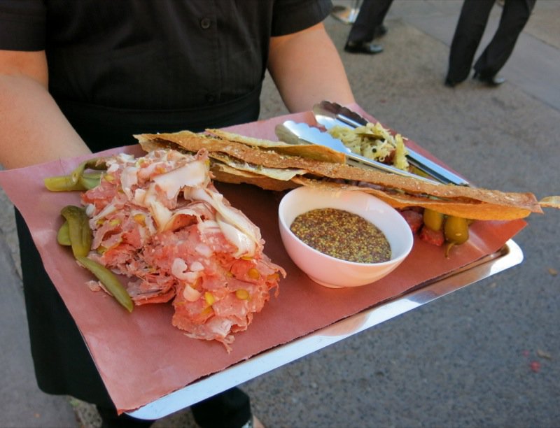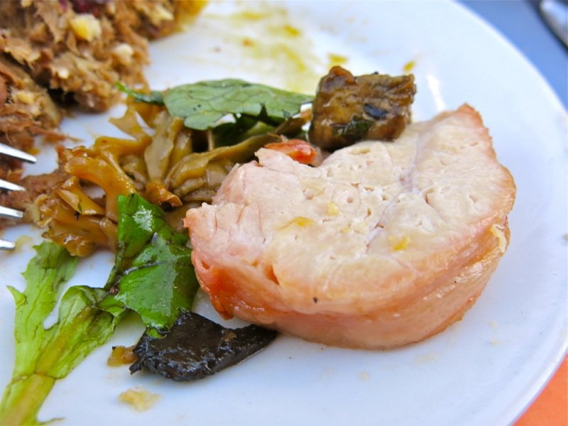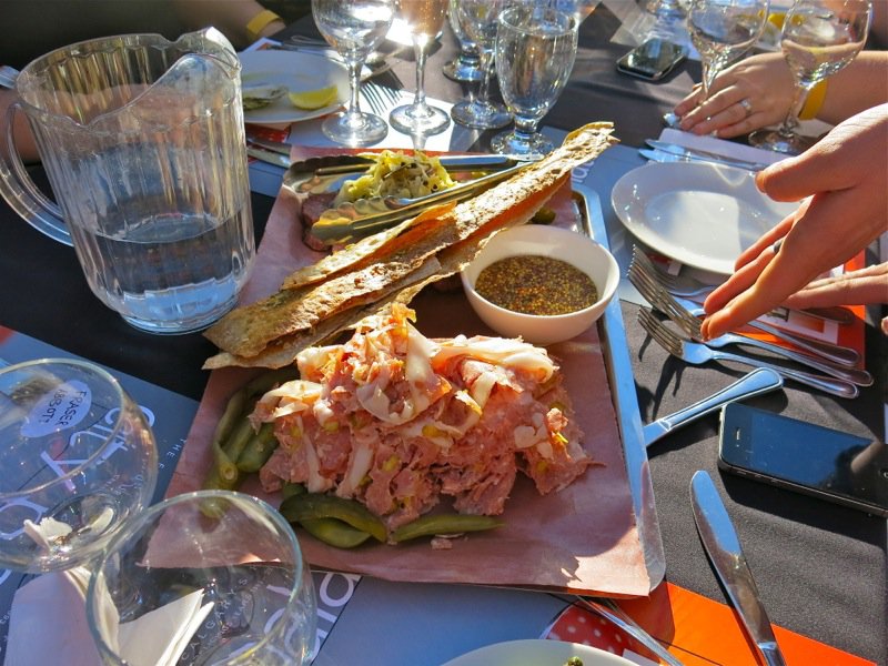 The coordination of the service was a pleasure to watch as it was synchronized simplicity. Servers lined up at the restaurant of service, received their platters hot (or cold) and marched out down the table to the end, each stopping at the predesignated point, a moment to wait for all to be in place, a nod from the lead, and then all trays were raised above the heads of the dining table and place in the middle of each, in unison. I remember reading an article in Bon Appetite Magazine a few years ago about a long table dinner in the South of France and seeing servers laden with trays of Pissaladière headed for the table in exactly the same fashion.