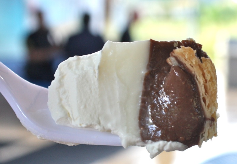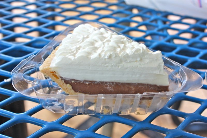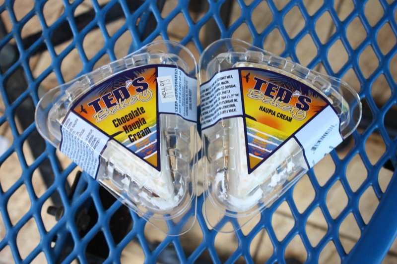 We had our coffee our on the blue powder coated metal table, joining another young couple there for a little early morning visit. Both were surfers, tattooed up the ying-yang, vibrant, healthy and oozing enthusiasm and vitality. “You have to try the Chocolate Haupia Pie.” The young fellow told me. That’s what Ted’s is famous for. You don’t come this far without trying his pie. So, we did. One haupia (coconut) and one chocolate haupia, as above. Apparently, these were made here, in a homemade fashion for years, until the tourism crowd (and there was no crowd on this day) made it impossible for them to keep up with the demand, and Ted’s had a company come it and develop the recipe to be made en mass.
