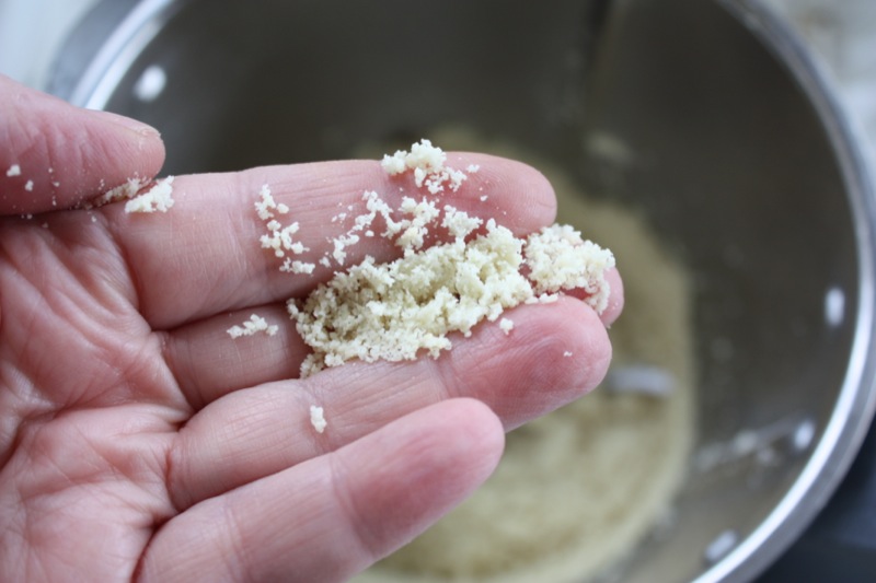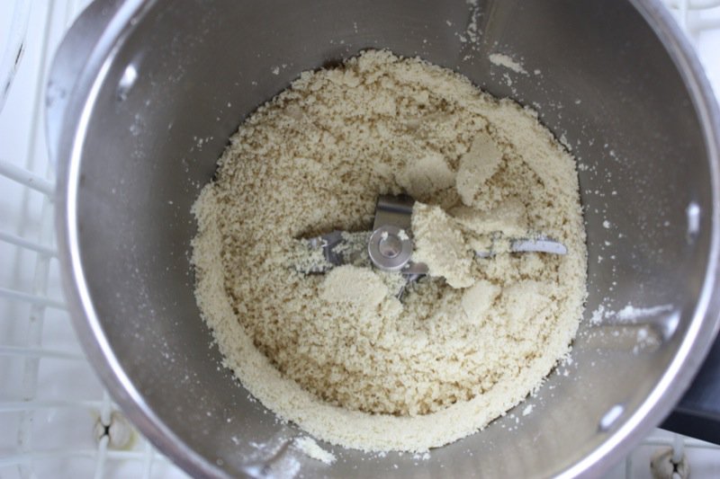 - Scale white skinned almonds into the TM bowl; mill for 10 seconds from 1-10 using the spatula to keep the mixture toward the blade; pulse as needed to get a fine texture; remove from TM bowl and set aside