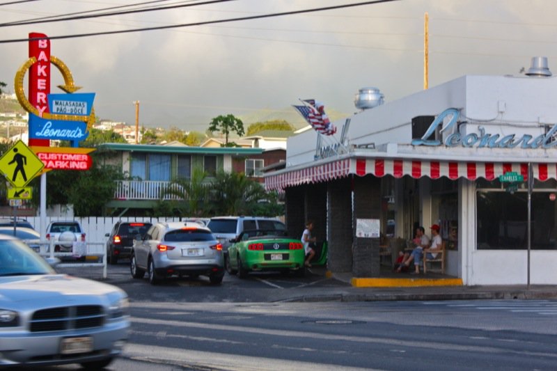 Can you see the Leonard’s sign? It is a very 50’s looking, which is part of its charm. So why were we looking? Someone said: You MUST go to Leonard’s for a malasada if you are in Honolulu and interested in the food culture. That is all you have to say to me. Thank God, Vanja, is such a wonderful accommodator and so much fun to be with. Leonard and Margaret opened this Bakery in 1952, and not long after opening, Leonard’s mother, who had immigrated from Portugal in 1882 with her parents, suggested making malasadas for Shrove Tuesday which was a Portuguese tradition. They were worried would be too ethnic an offering, but the malasadas were a huge hit and, the addictive cravings for malasadas in Hawaii was born.