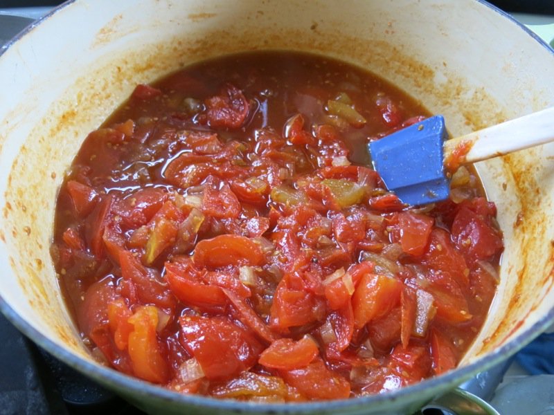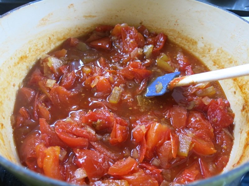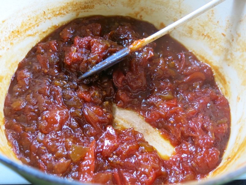 When the tomatoes darken and a path can be left in the bottom of the pan, the preserve is close to being finished. You are now in the danger zone.