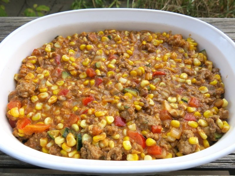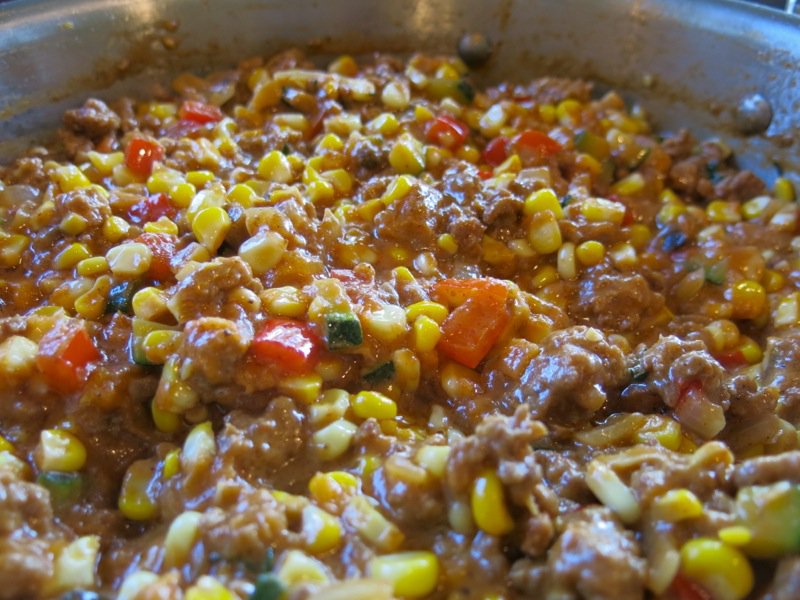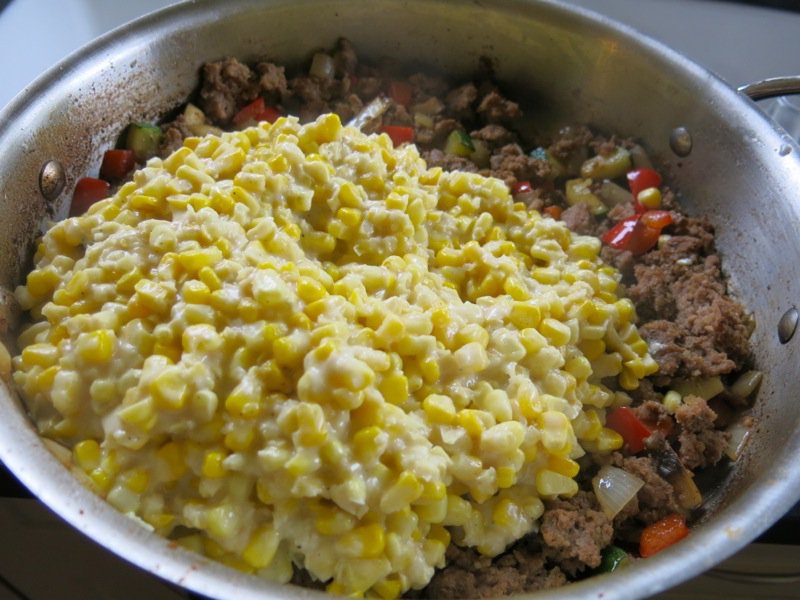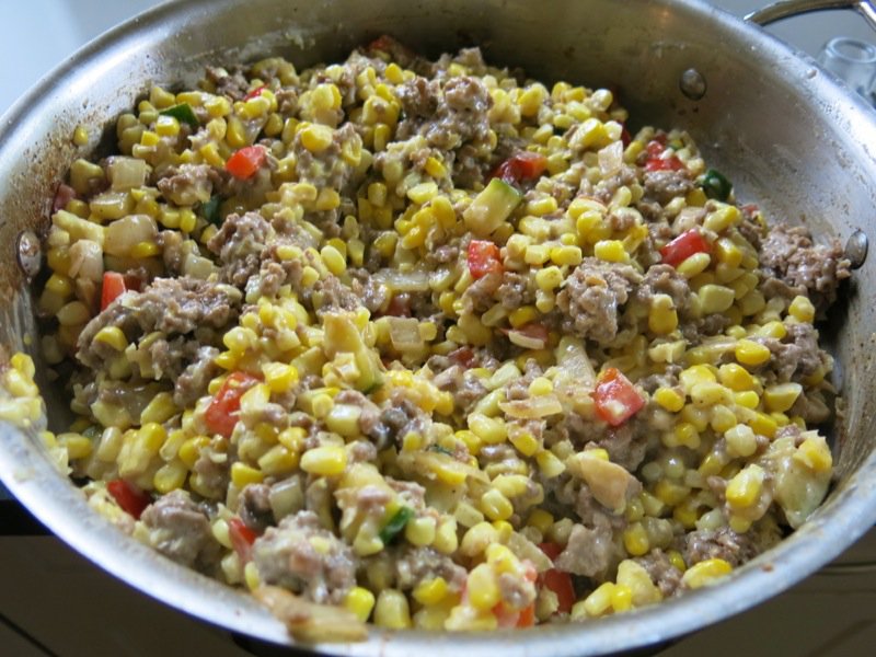 Ground beef, corn and potatoes. I’m thankfull for the change and will probably add a few more spices to the meat. Can’t hurt. More people should take a cooking class.