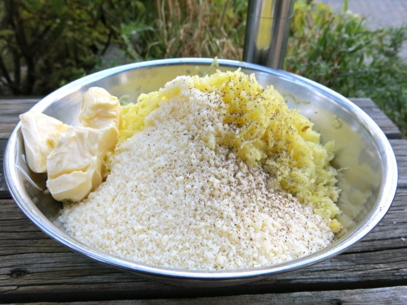 - Add the freshly grated Parmesan cheese, 1/2 teaspoon freshly grated pepper and 1/3 cup soft butter; using a wooden spoon, mix to combine well