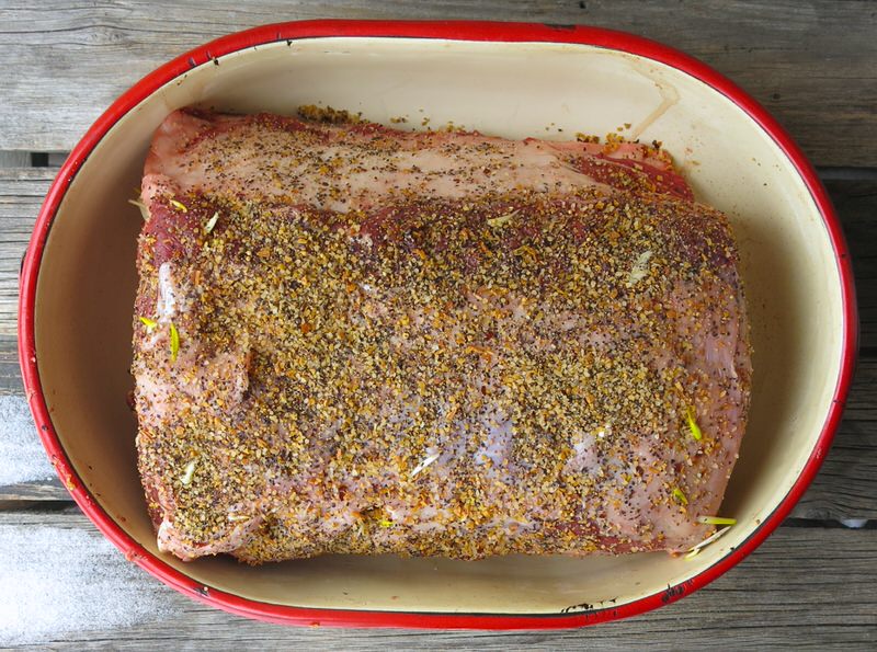 Rubbed all over, and onto both ends, the spice mix seasons a prime rib perfectly and is as significant to the flavour profile of this roast as the garlic.