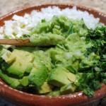 - OR do what Chef Claudia did and divide the surface into quadrants placing cubes of avocado in one, onions in another cilantro in another and the queso fresco in the last, mixing the middle together for self service