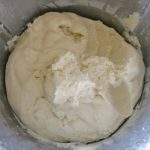 Keep going; scrape down the sides of the bowl. Pay attending to the instructions. Look at that lovely final product, above right. It looks quite pasty to the eye. Almost wet.