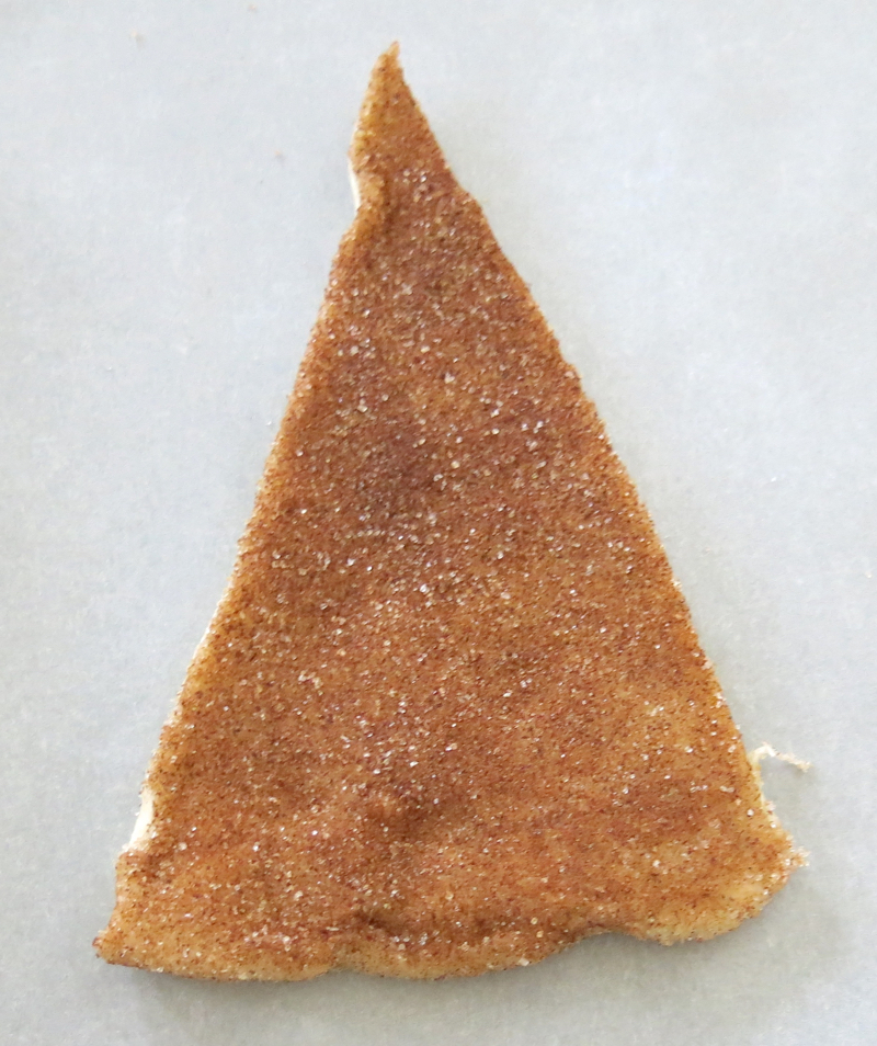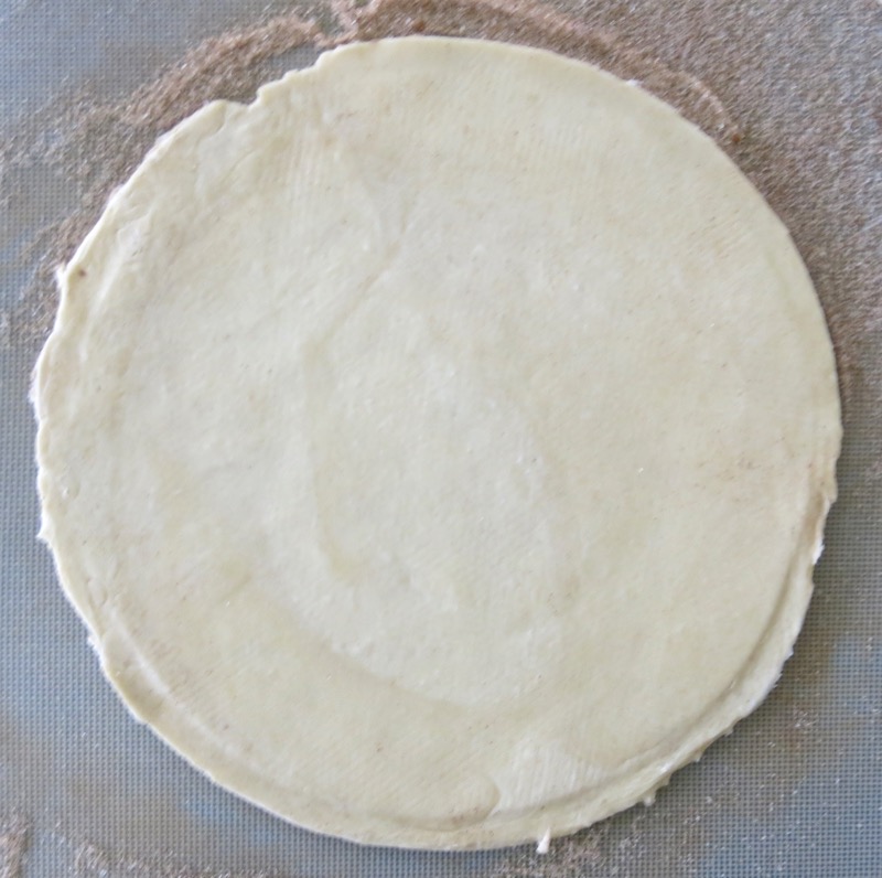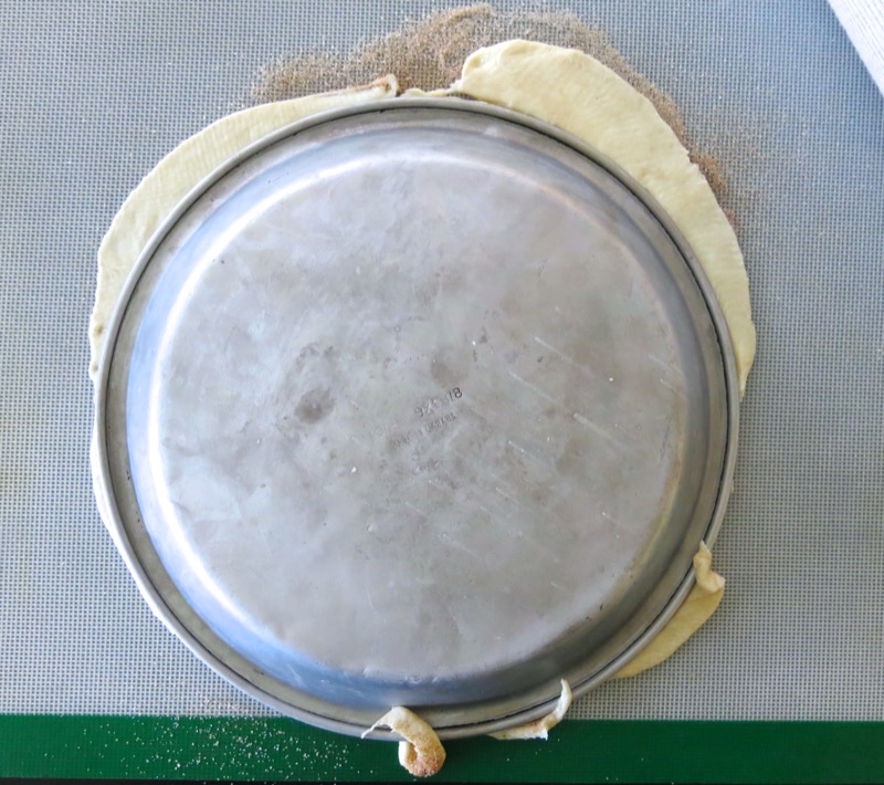 Simple, but what a learning curve. I turned one disc of dough over onto it like it was flour before realizing, “No. I cannot do that!” It was a tough little shift in my dough rolling paradigm to be rolling dough out onto cinnamon sugar, believe me. However, it did roll effortlessly into a circle and is a beautifully supple dough to work with.