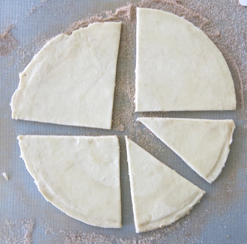 - Divide circle of dough into 4, then into 8 triangular pieces: a pizza or pastry cutter works great for this