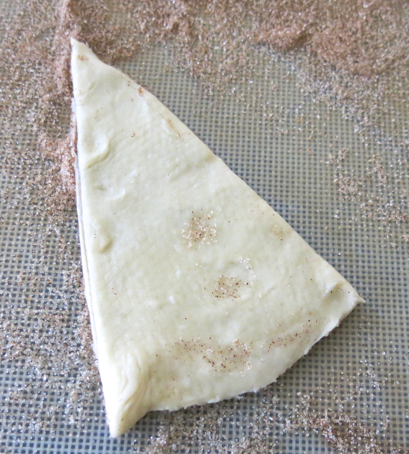 I actually roll them with the cinnamon/sugar mixture on both sides. And never cut a perfect circle. I fold