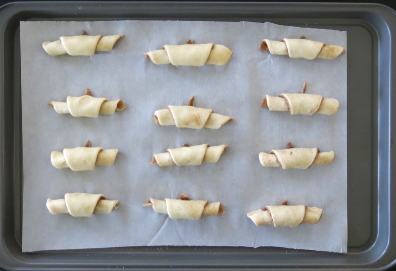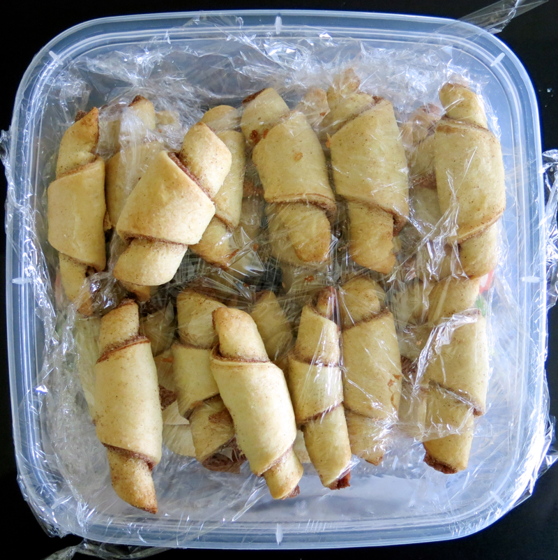 Rolling this way, above, was easy enough, but I had to move to a clean spot, and flip the triangle over so the sugar side was up, then roll. They looked better. Likely, as that was what I was used to doing with my rugelach. But, before barging on, like I know everything, I waited until the first batch baked, then cooled. The ones with the cinnamon outside were dryer and harder. The mouthfeel on the ones rolled with the cinnamon on the inside was more appealing and they were more tender and moist. It seemed logical to roll them with the sugar out, but they must be rolled with the sugar in was what I concluded.