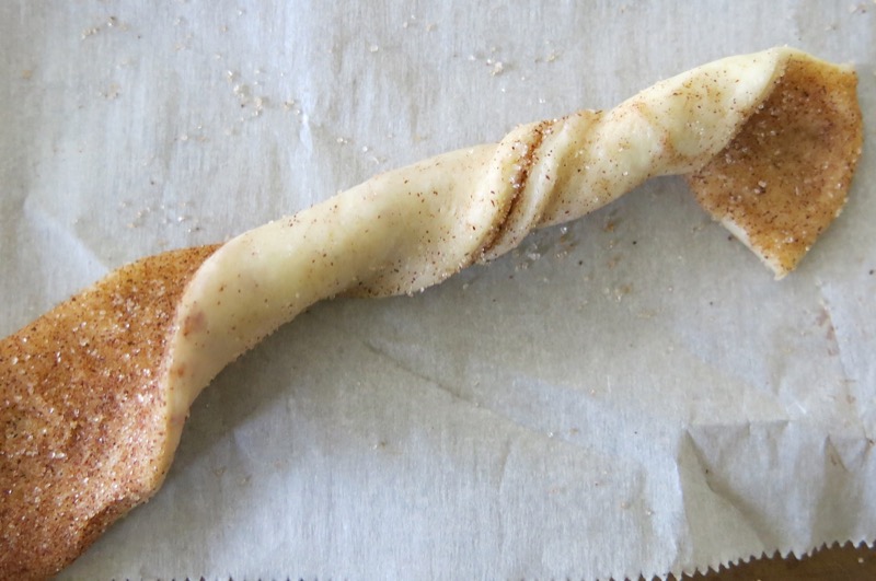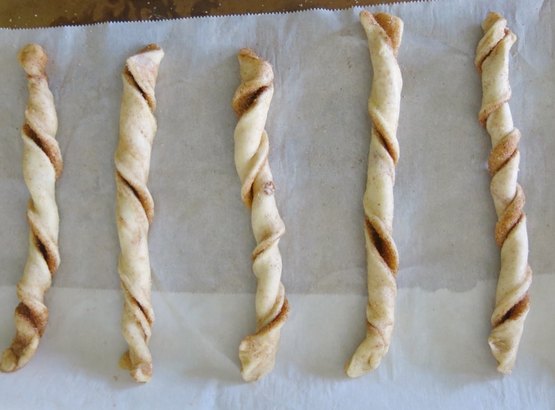Again, the same question presented itself: cinnamon sugar side in, or out. Or, should I just twist them in a very haphazard rustic fashion and leave both sides exposed? Nope. Cannot do that. Decided to go with sugar in, again.