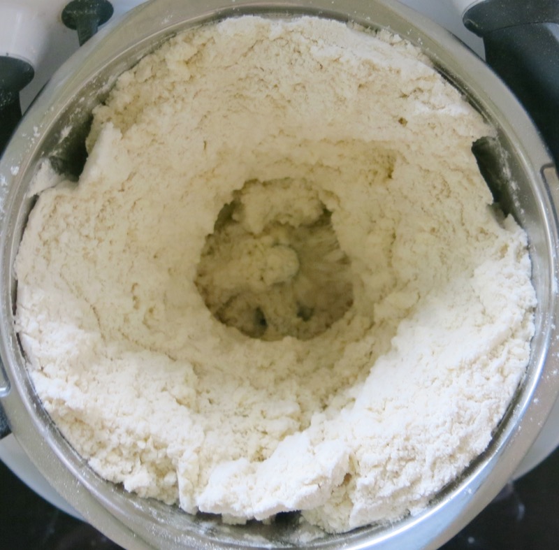 - Weigh cold butter cubes into flour mixture in TM bowl; use hand or wooden spoon to mix butter cubes inside TM bowl with flour (without machine running)