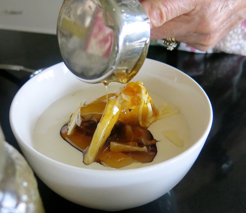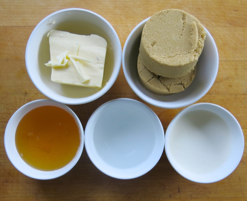 Mis en place, above, for mom’s goo. She uses golden corn syrup. I use honey. I choose natural whenever I can, though Grandma Maude’s Popcorn Cake and Butter Tarts are the only recipes that I use it in as both are iconic for our holiday table. If you have no idea what I am talking about, regarding the “evils of corn syrup” or GMO corn, in general, just read Michael Pollan’s The Omnivor’s Dilemma.