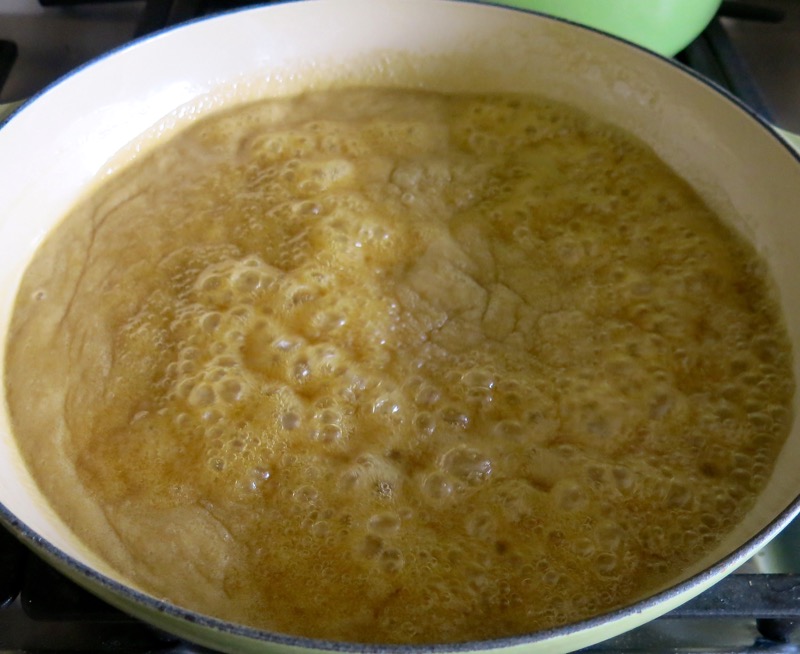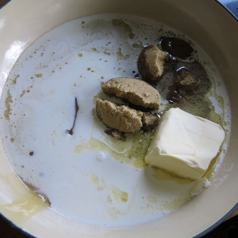 All into a heavy saucepan, brought to a low rolling boil for 3-4 minutes, then into the bottom of the baking pan.