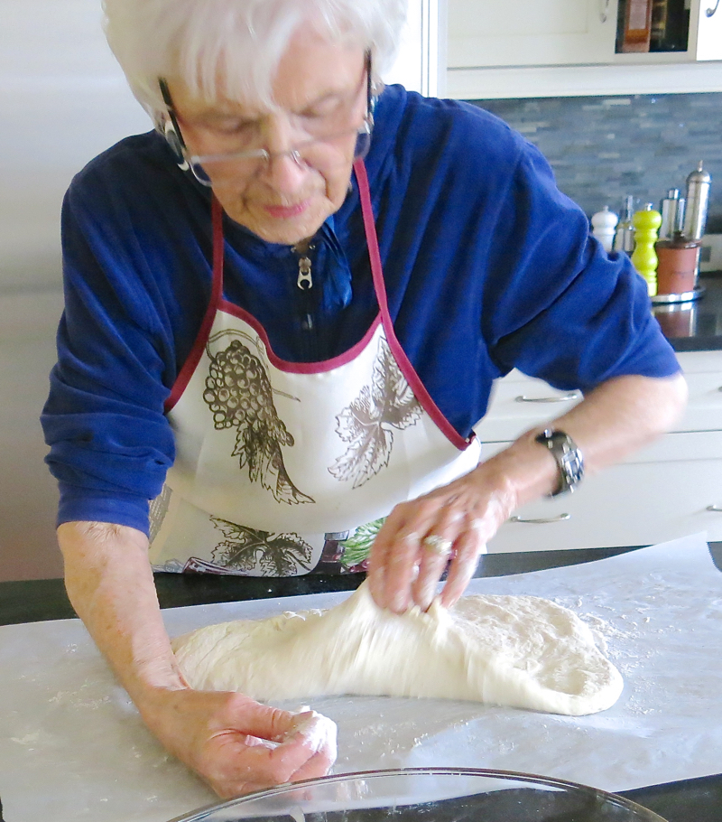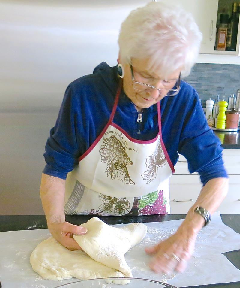 When I think of my mom, the first image that pops into mind is her standing in the kitchen, bread pan on the stool at a good height for kneading, hands dripping with bread dough, shovelling in flour and in the memory clip that I love, brushes back hair with the back of her hand, leaving a smudge of flour on her cheek.