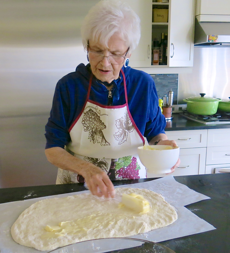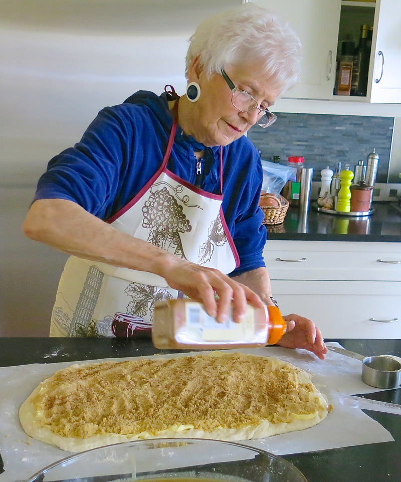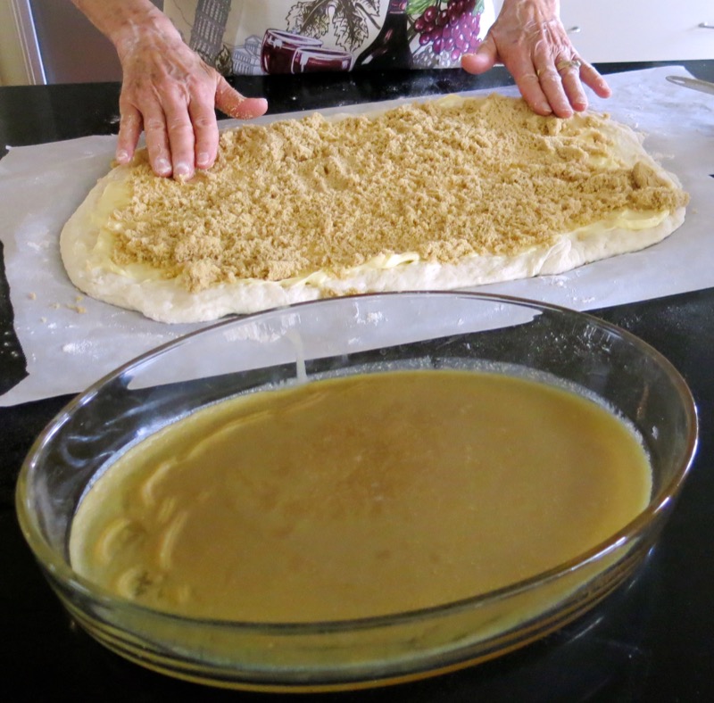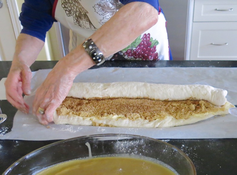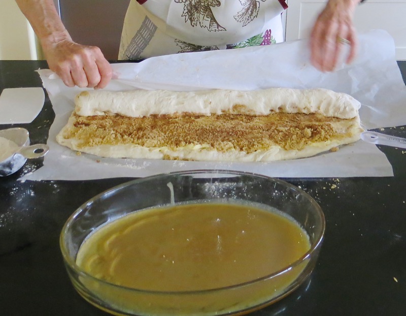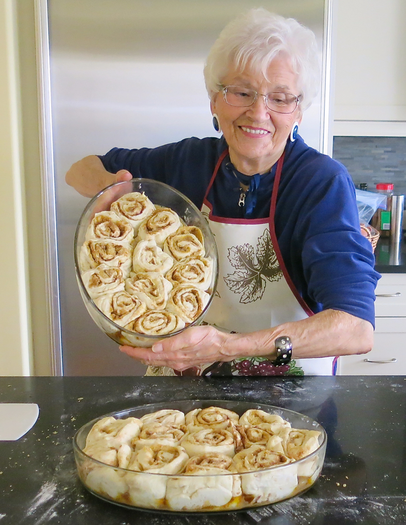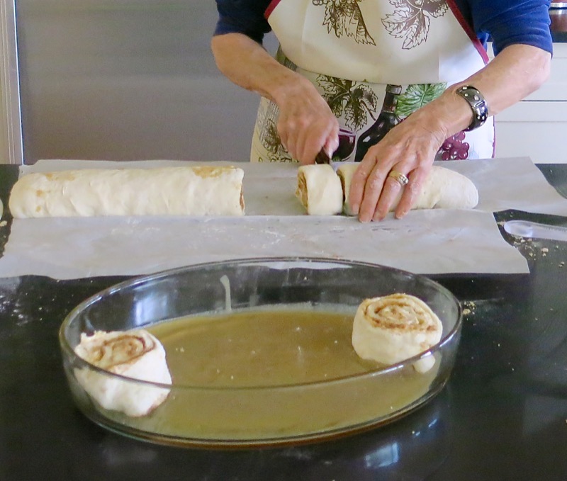 Onto the goo each slice went, and at 86 (87 in April), she still knows how to portion her pan: one at each end! When plopping them into the pan, the prettiest side goes down into the goo. Why? The pan of buns gets baked and then after cooling a bit, inverted so that the goo is on the top. Thus, the prettiest end of the slice goes down into the goo.