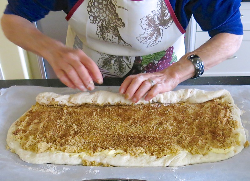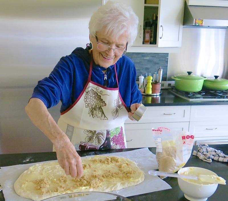 Why no mis en place for the filling? “I don’t measure what I do. Never have!” But, I did watch and measure, so the ingredient amounts mom used are included in the recipe. She used almost a whole cup of butter, but went back and “evened it out”, so a good 3/4 cup was generously slathered over the supple dough. This was followed by a packed cup of brown sugar. She used the entire cup and it was the “perfect amount”.