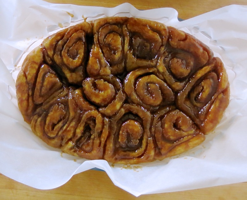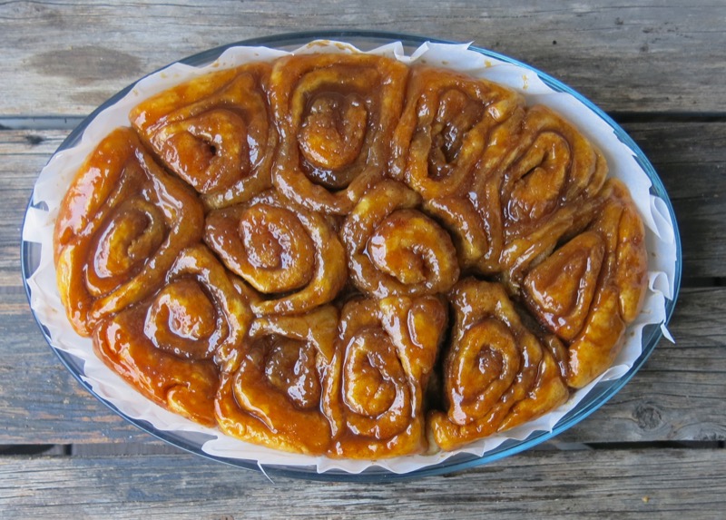 If serving the buns hot out of the oven, I flip them onto a serving tray and present with a resounding, “Ta-da!” But, usually, I freeze them as I make them in advance on a baking day. So, I flip them onto a piece of parchment paper. Wash the dish they were baked in, and then set them back into that dish.