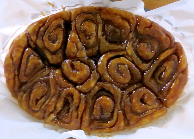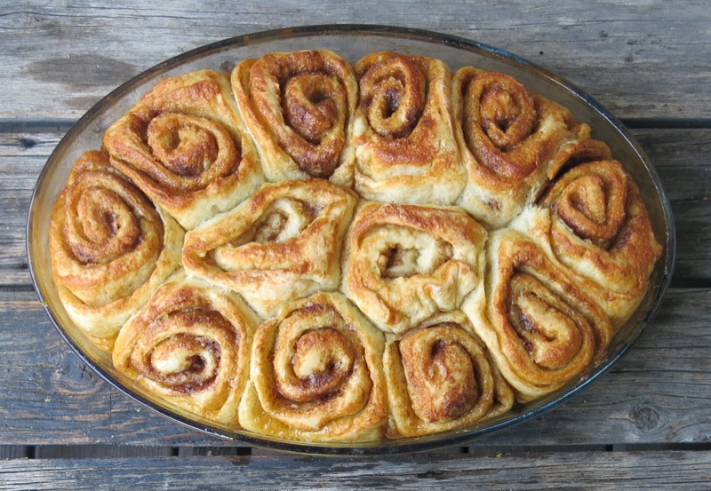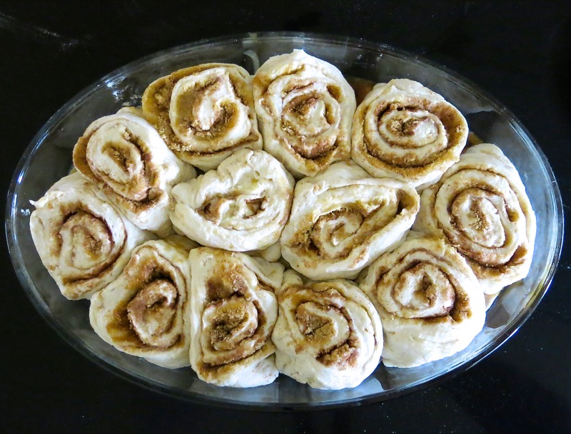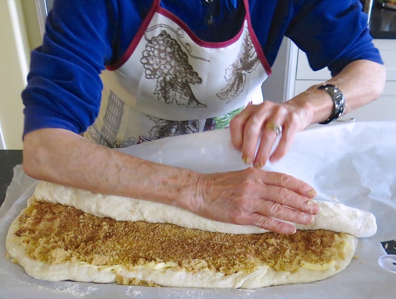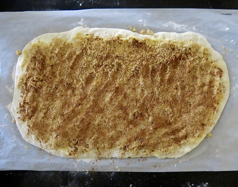 Our cinnamon buns were made with regular bread dough. The butter was melted, and poured onto the flat slab of doubh, then the brown sugar spread about on it before the cinnamon was sprinkled — I don’t think we actually measured. We just hsook and shook and shook the cinnamon bottle!!! And then sometimes there were raisins added (pre-plumped and drained), perhaps even some walnuts.