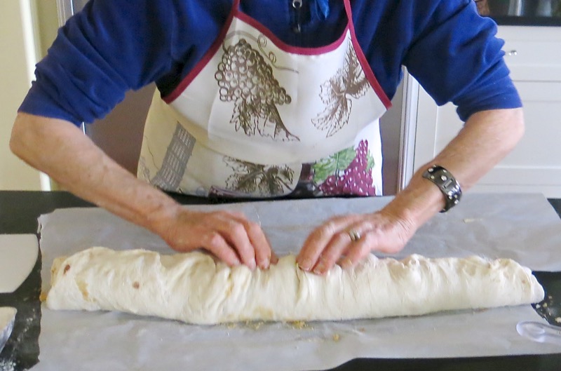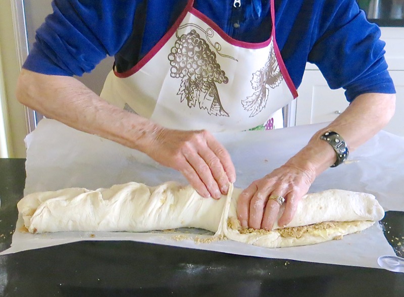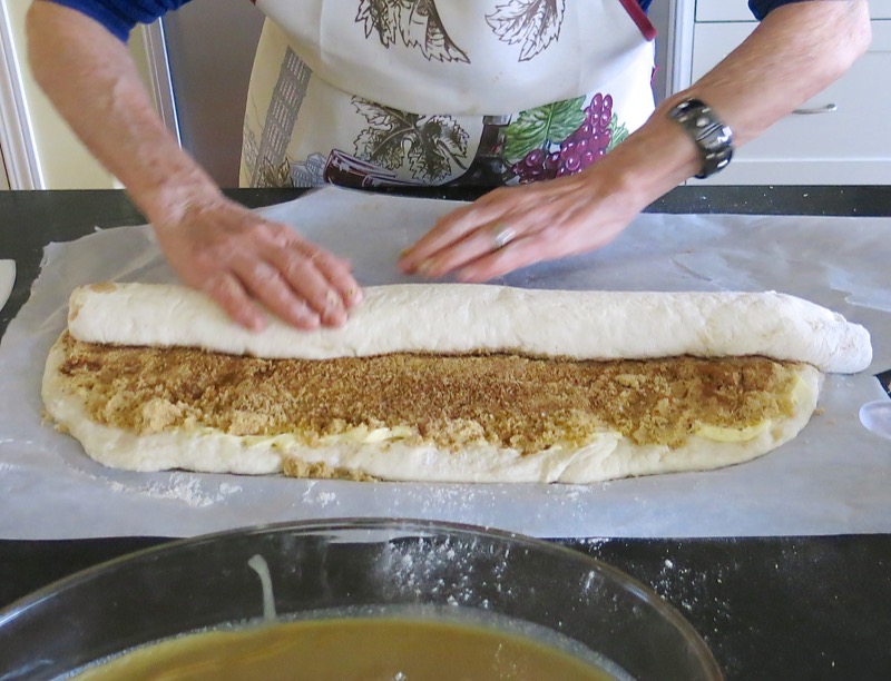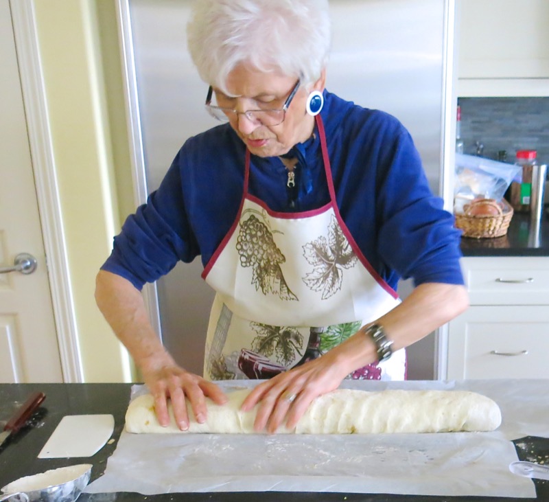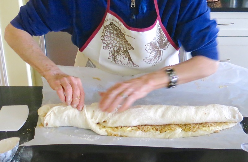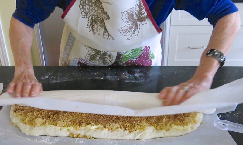 It isn’t really “all that technical”. It is just common sense, really. Yet, if you are new to baking, hopefully good tips for you. Above, she is lifting the parchment, getting ready to guide the dough to its finished roll.