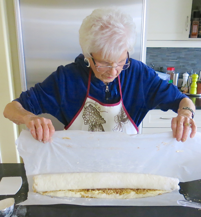 I am always surprised by the stronghold she takes to the dough. She pulls it up and around the log with confident vigor and pinches it securely in place to ensure it will not open. I usually worry about pulling the dough this thin, and just roll it over onto itself, seam side down, and start slicing. Yet, this is mom’s technique and it makes beautiful buns.