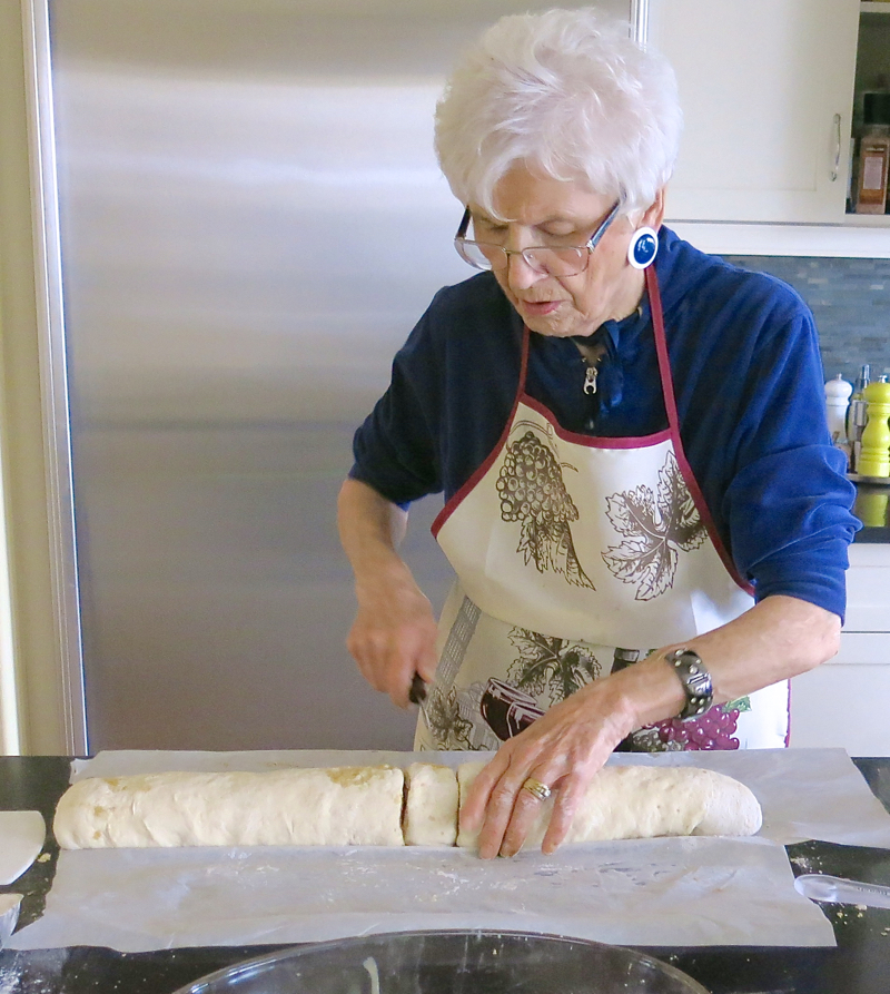 What a gorgeous length of the dough. She took a moment before she started slicing to determine the middle, and to decide how wide to slice each portion, then estimated the total.
