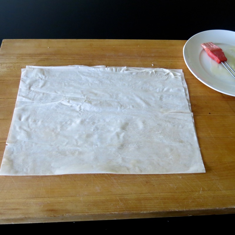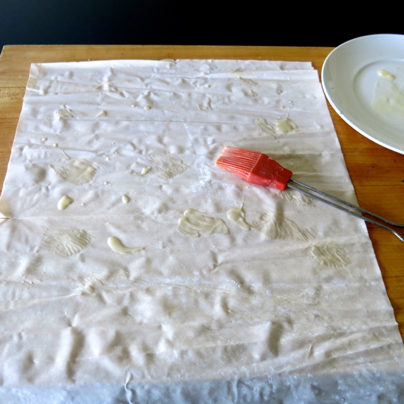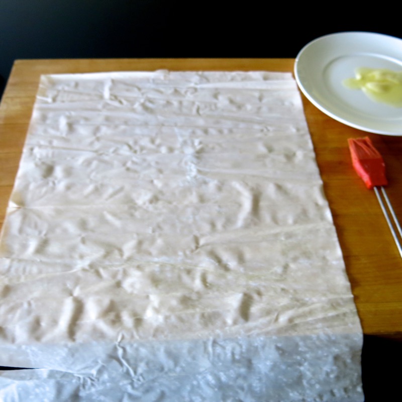 - Lay one single leaf out on your work surface; lightly brush or drizzle melted butter over the top half of it sporadically; do not cover with butter as it will be far too much butter