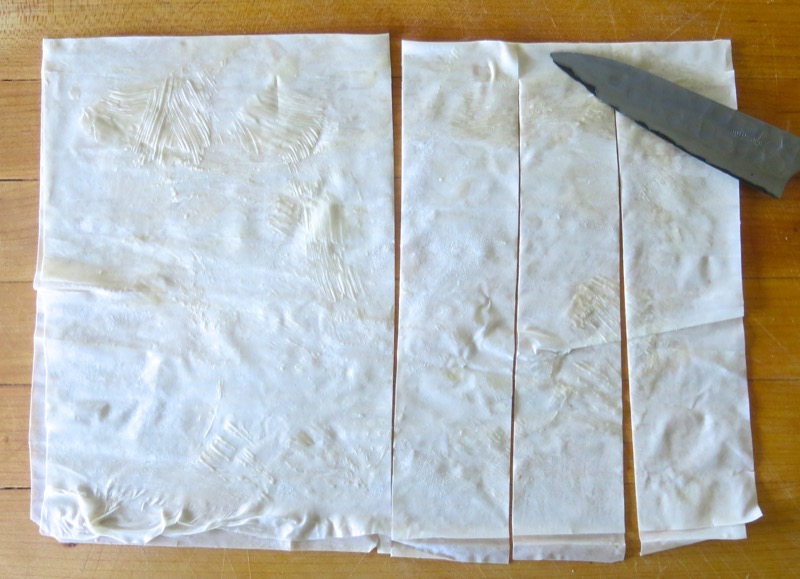 - Make 6 even vertical slices into strips; place a small amount of filling in each bottom right triangular corner of each strip of phyllo