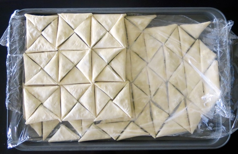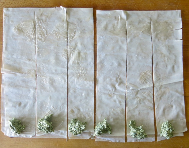 Mis en place for filling, above. But, this amount of filling will actually use 2 complete boxes of phyllo dough, so I suggest you make the filling with a friend and then have a great visit while you each fold up a box of the phyllo into triangles, or go home and each fold your triangles while listening to some good music or watching a movie. It took me about 2 hours to do them all after I had the filling chilled and ready.