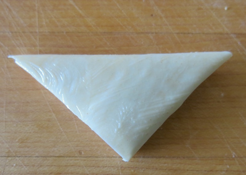 - Where the open edge is, and the right angle is formed in image one, fold the triangle directly over that seam to enclose the opening; essentially, you are just flipping the triangle straight up and over with the previously open end at the bottom of the triangle now enclosed with the pastry folded over it