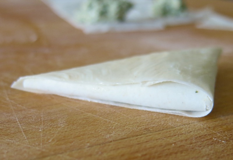 - Fold that over, and continue folding, triangularly, as you fold a flag, until you have completed one spanakopita triangle
