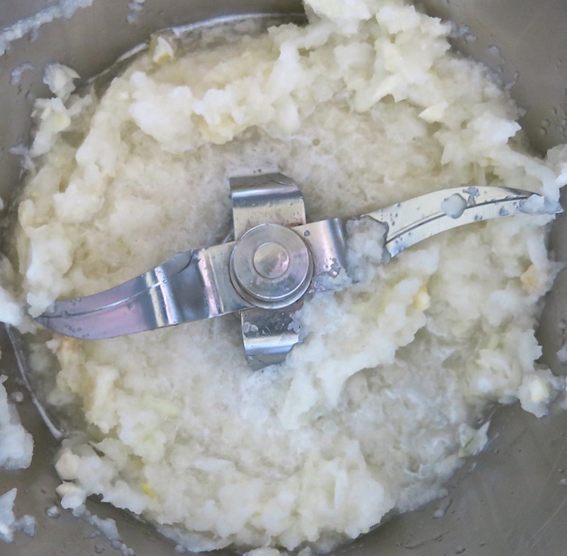 Be careful with your onions. The recipe calls for a specific amount, but keep the flavours balanced. The amount in the above left photo is far too much for the entire recipe. The onion I used was huge, and 1/4 of it, or half of what is in the mis en place bowl is the correct amount for a good balance of flavour. So, half was kept, the rest left in the bottom of the bowl, and the ingredients whizzed up into a tangy blissful mass.