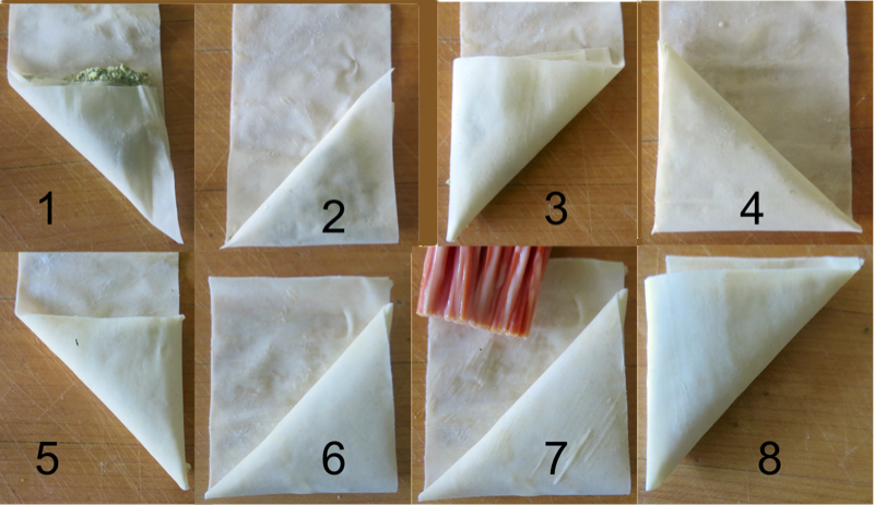 - Fold the filling over onto itself to form a triangle at the bottom of the strip of pastry