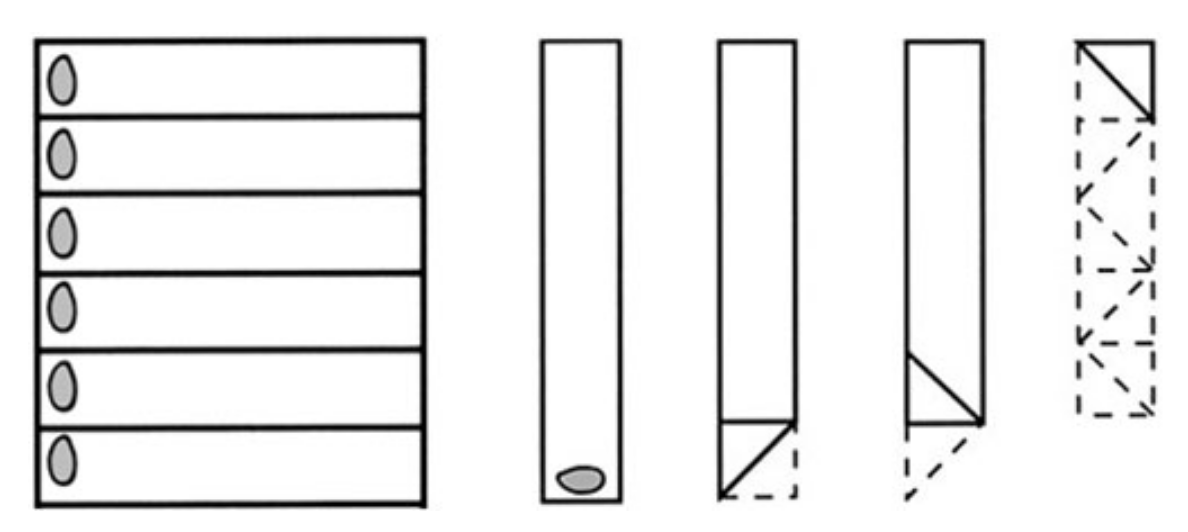 - butter the folded half sparingly, then slice it into 6 even strips as below