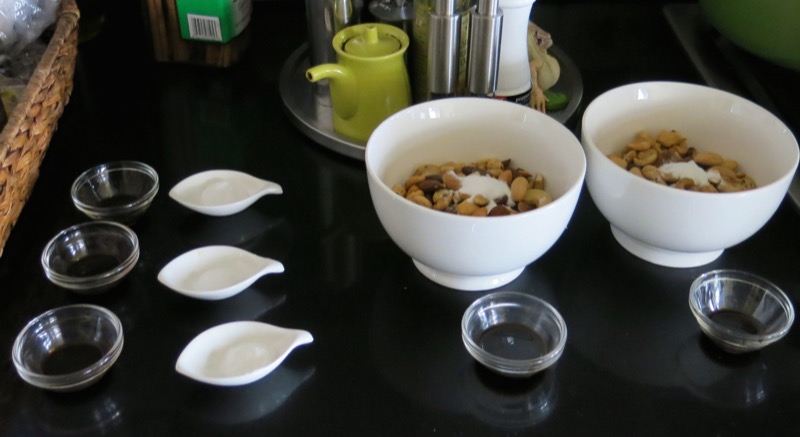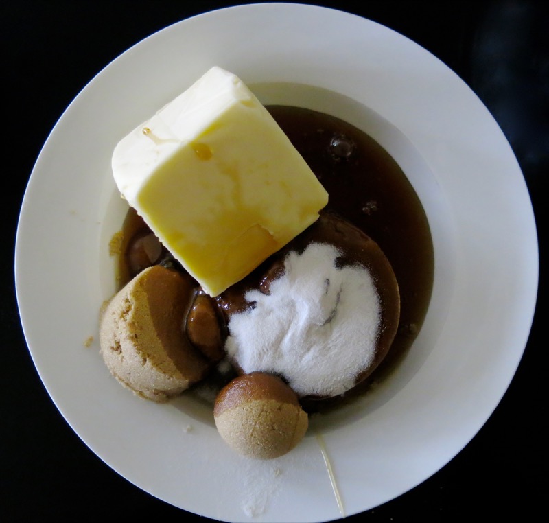 The mis en place for each batch of caramel sauce in each individual bowl is transferred to a heavy pot when ready for the next batch. Heating it for 40 seconds before moving it into the heavy pot helped thin out the viscosity of the corn syrup and the ingredients plop into the pot with the aid of a spatula.