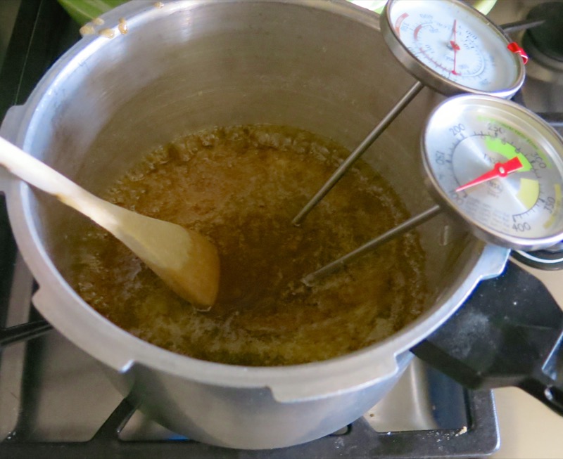 - *Watch carefully: it takes quite a while to approach this temp, then is suddenly there (if higher temp is achieved, a very brittle product results)