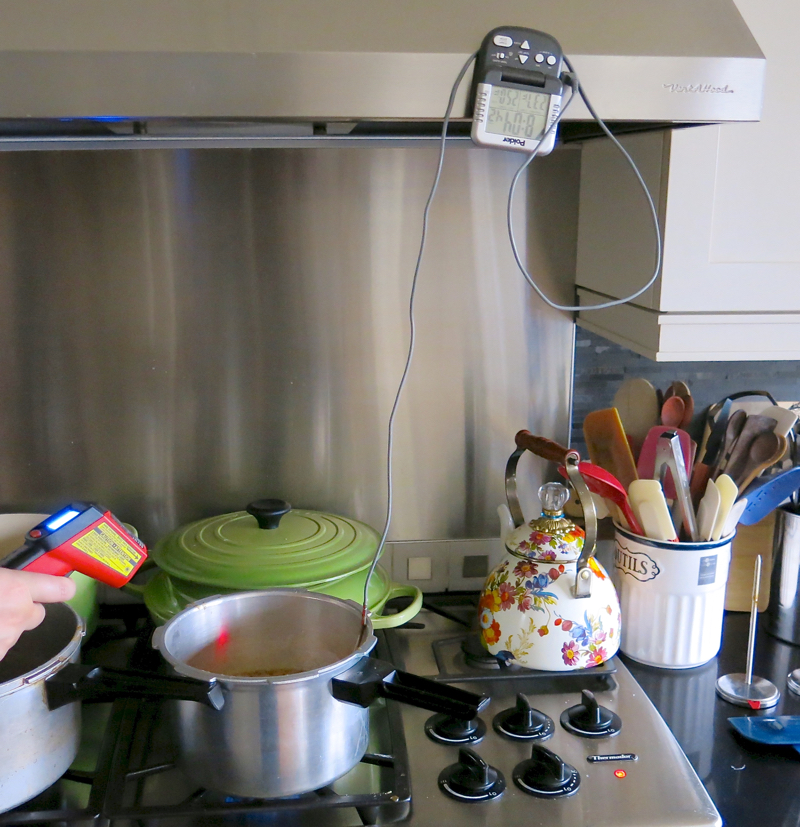Very technical. Love the thermometer on my hood fan, and you can see Ragan’s hand, to the left holding the infra-red thermometer which worked like a charm as second confirmation.