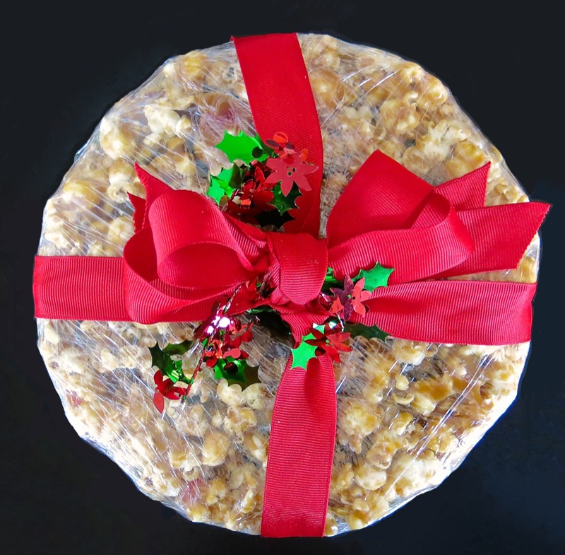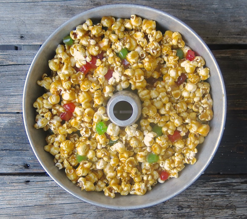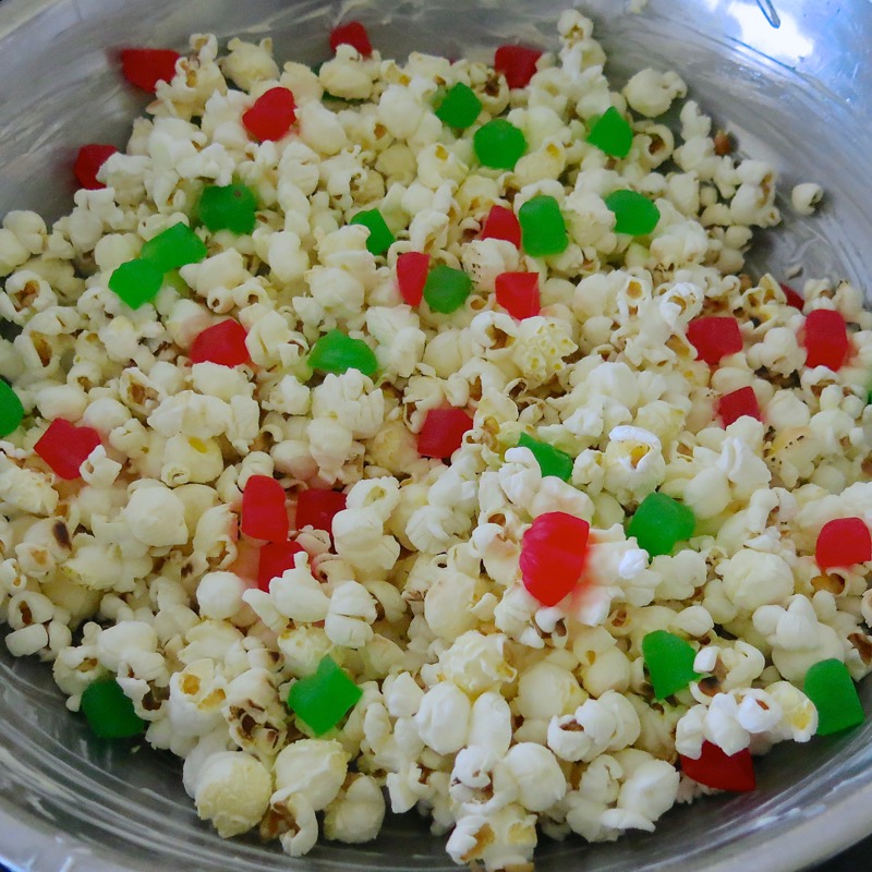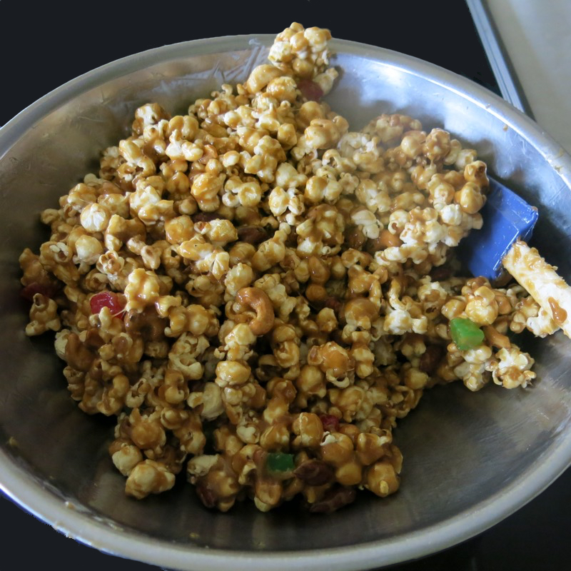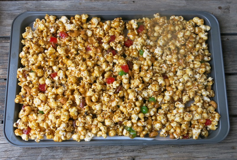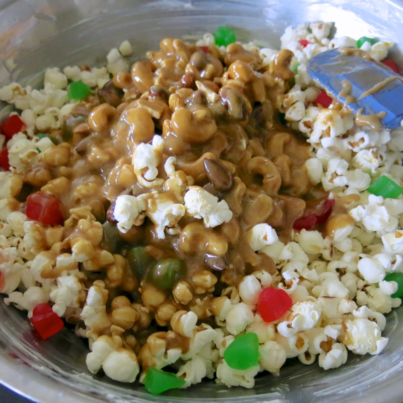 I often pop the popcorn the day prior, and place the portion for each batch in its own plastic bag. We definitely buy and quarter 1/2 cup red and green jujubes per batch a few days in advance and I portion them out in small baggies or cups, as well. The nuts are measured, toasted then portioned. The day of, I butter a big bowl for mixing the caramel popcorn generously, place one batch of the popped corn in it, and carefully sprinkle the red and green jujubes over the top. I have learned not to mix them into the popcorn, as they are heavier than the popped corn, and will immediately fall to the bottom of the bowl making it much more difficult to evenly distribute their colourful fruity goodness.