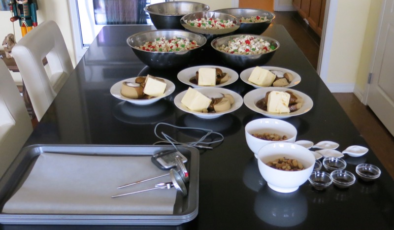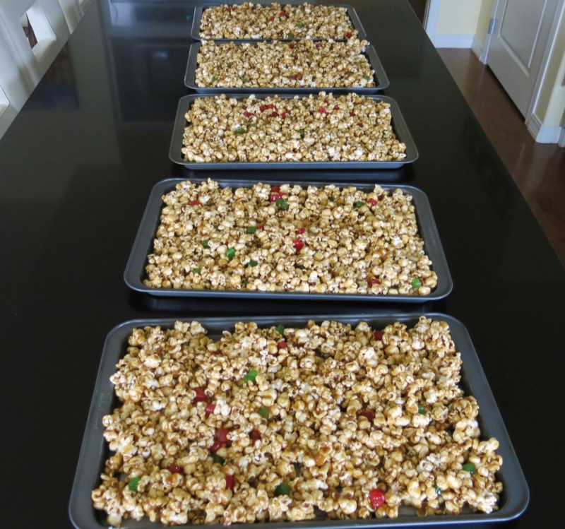 I simply pop 10 1/2 cups of popcorn the day prior… and put in a double bag garbage bag, sealed tightly. Each will make 11 cups of popped corn or a little more. Then, as you see in the images – I make 5 at a time. I put all of the ingredients, as described along with the images in each of 5 bowls, respectively. I prepare the caramel sauce bowls (10 usually) with the exact per batch ingredients. Then get 5 large bowls out, butter them. I chop or slice the red and green jubes and have them divided into 10 ziplock bags a day or 2 prior. I toast the nuts and also divide into little baggies. I have the vanilla and baking soda beside the stove with 2-3 candy thermometers and 2 heavy pots on the go at the same time. I start them both and accelerate one and slow the other until the first is done. When the first caramel sauce reaches temperature, I hold the other at a lower temperature. Immediately add the baking soda, vanilla, and nuts – if I add nuts to the batch – and move to pour over the buttered popcorn-filled bowl with jujubes evenly distributed in it. I do this while waiting for the caramel to heat. After ensuring quickly, and gently, that all kernels are covered with syrup, I place all on a parchment covered cookie sheet and usually sit outside to cool. I then turn, bring up the heat on the other heavy pan on the stove a little, wash the pan just used and dry it very well. Get the new ingredients and thermometer into it and watch the temp on the first one closely. I love my thermometer that beeps when ingredients reach temperature. Meanwhile, I get the popcorn measured, into a buttered bowl, evenly distribute the jujubes and am ready for batch 2. I keep this pace up – and it is fast – I can do 10 in 2 hours. After completing 5, I wash the big bowls, regroup and continue with the last 5. Hope this helps! Let me know how it goes!