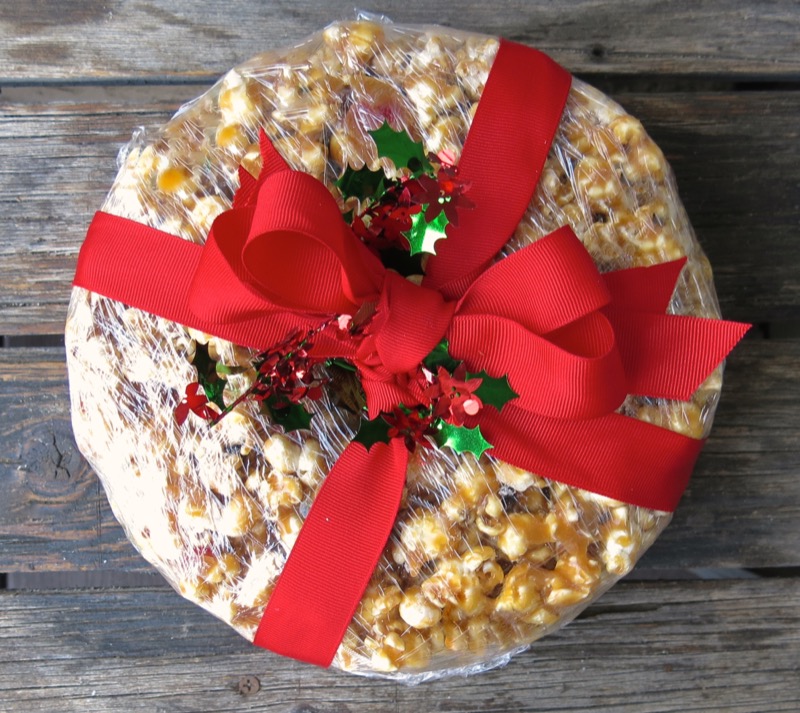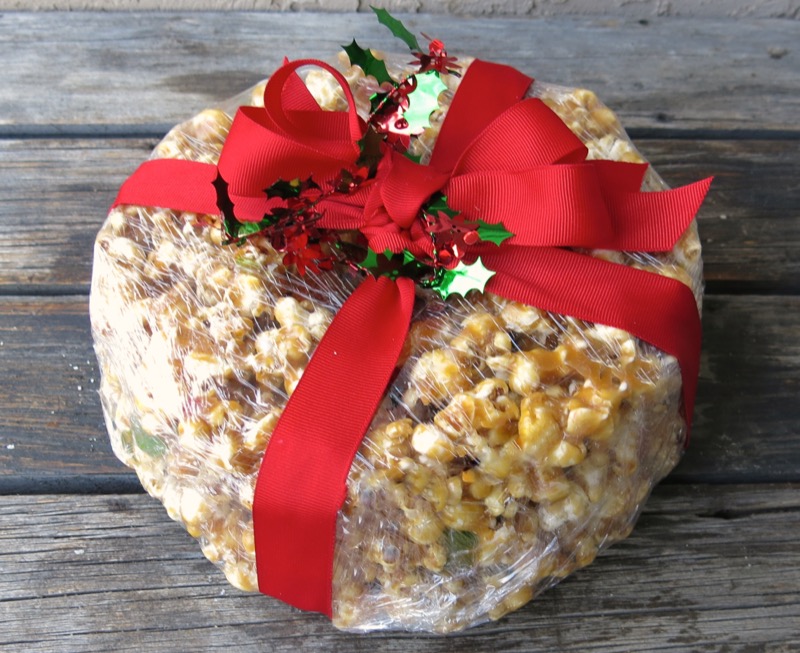 One year, Luciana and I made 50 of these cakes together. Prepped the day before and made 50 the next day. I had each earmarked for gift giving, but I think she had already other gifts for most of her pals, as I do believe she still had some piled in her garage months later. Suffice it to say, we never made close to that many again. Each batch has 11-12 cups of popped corn, so three lovely gifts can be made of one batch, in reality. Twelve small popcorn balls can be made from one batch, too!