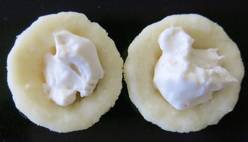 Above, the “bottom halves” are in the upper portion of the image. Place the tart shell filled with cream only over the cherry filled half to create a ball.