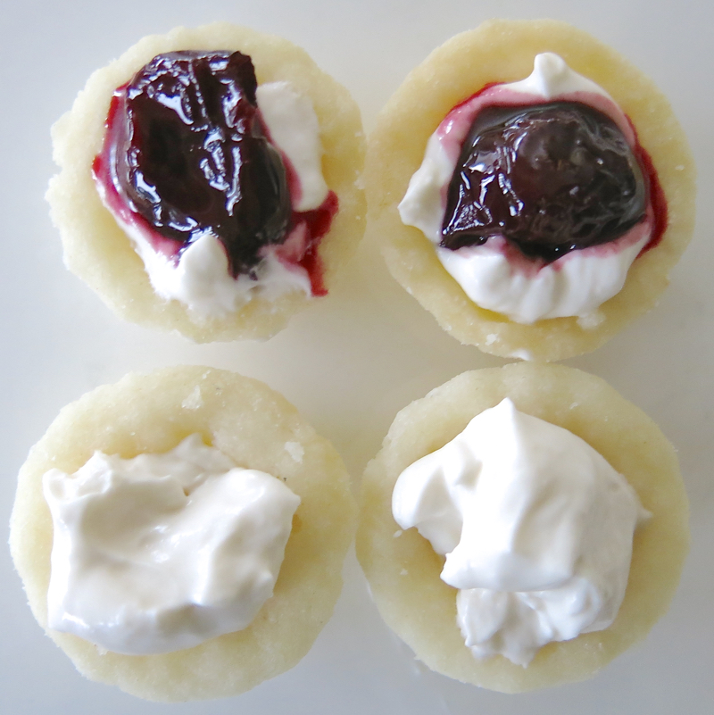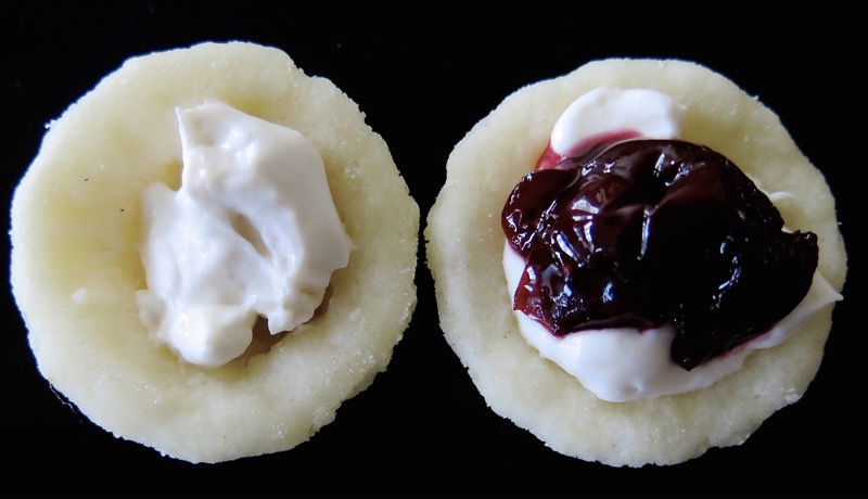 - Using 1/2 of a preserved cherry, press cut side down on the top of the tart dome: the stickiness from the centre of the preserved cherry will enable it to stick to the shortbread tart