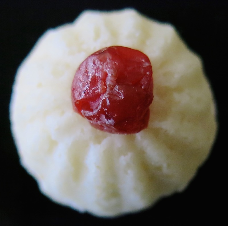 One preserved sour cherry is placed on the “bottom half” of the ball tart.