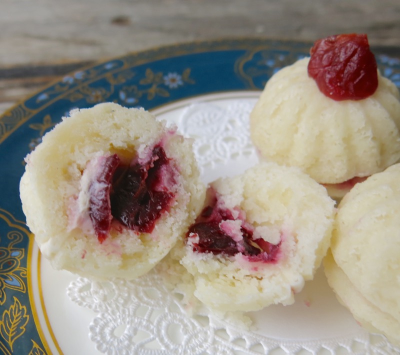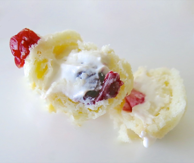 What does it look like inside? I want to see it! Tip #1: best eaten popping the entire ball into your mouth at once. You will never “see” the inside surprise in this fashion, but you will most definitely enjoy an incredible taste and texture experience: buttery flakes shatter giving way to a thick rich full bodied cream encasing a chewy tart burst of cherry-berry “let the bells ring out” festive fun! If you bite into it, instead, the ball crumbles and it is very difficult to capture the falling bits.