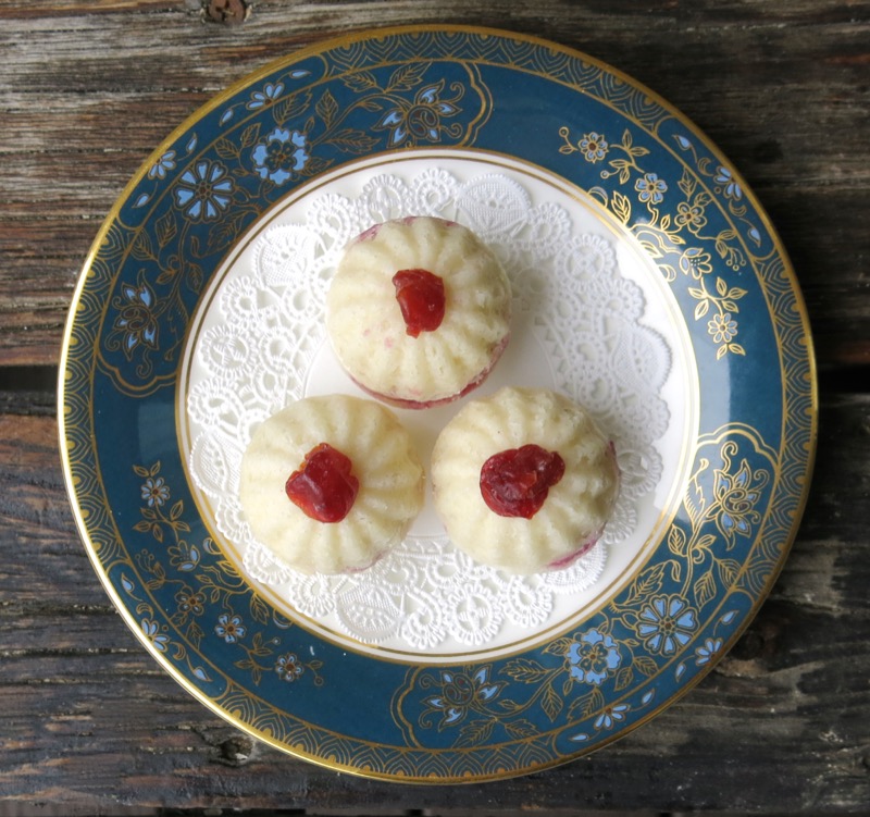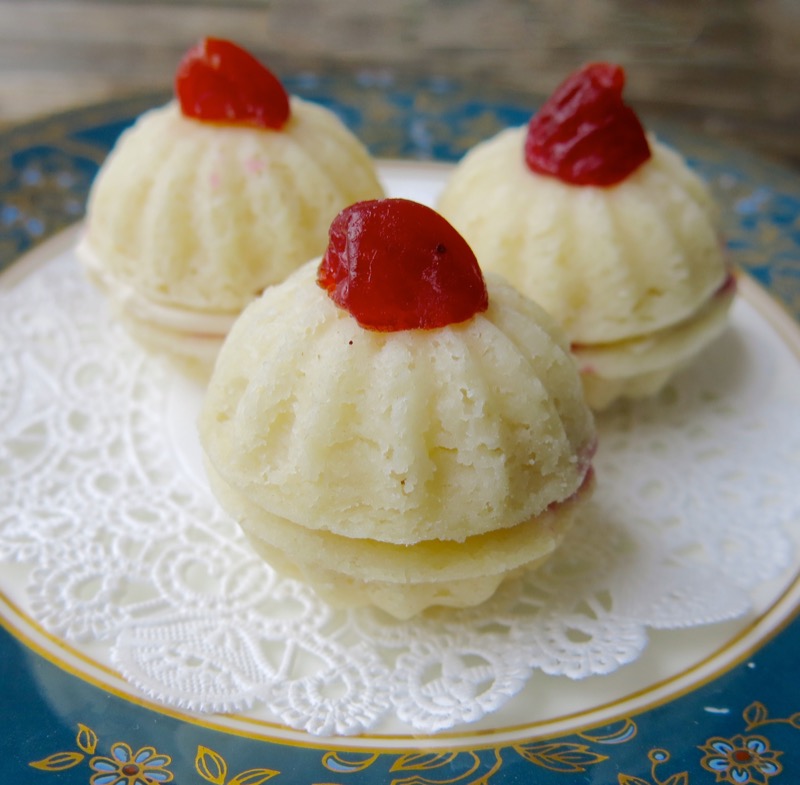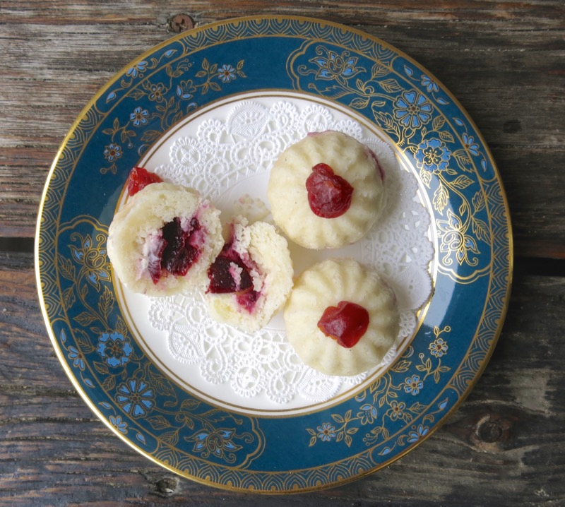 I had filled the shortbread tart shells with sour cherries and lemon curd a couple of years and that was pretty, and delicious. But, this year, scrounging through my pans and cutters, I found a tart pan I hadn’t used in a few years that inspired me to make a tart ball as I recalled when using it last time into little Apricot Tassies that I never wrote about, that the tart shape formed a perfect ball when one was placed upon the other.