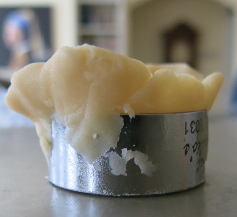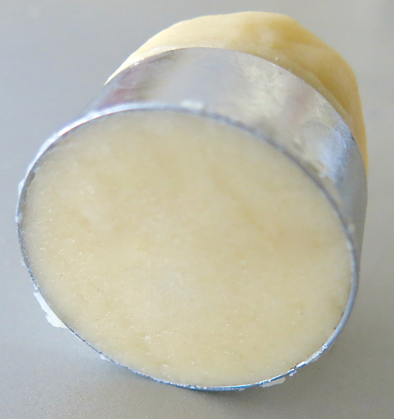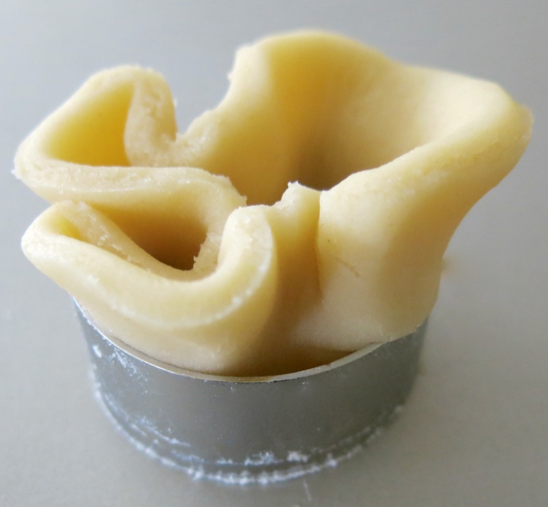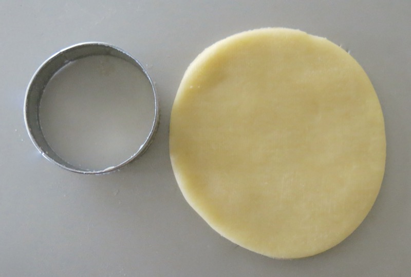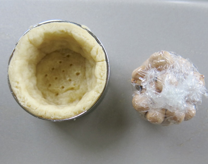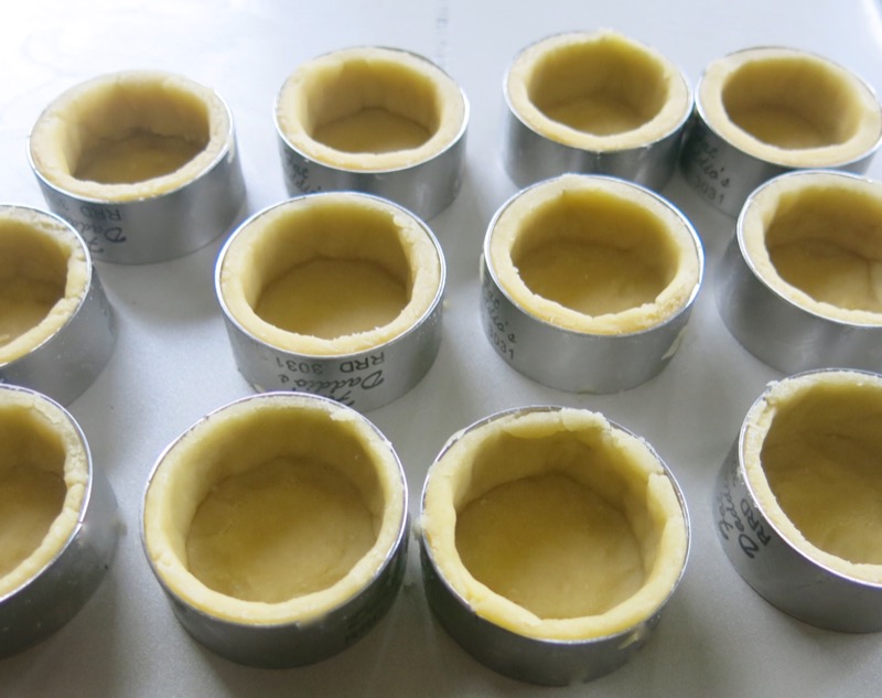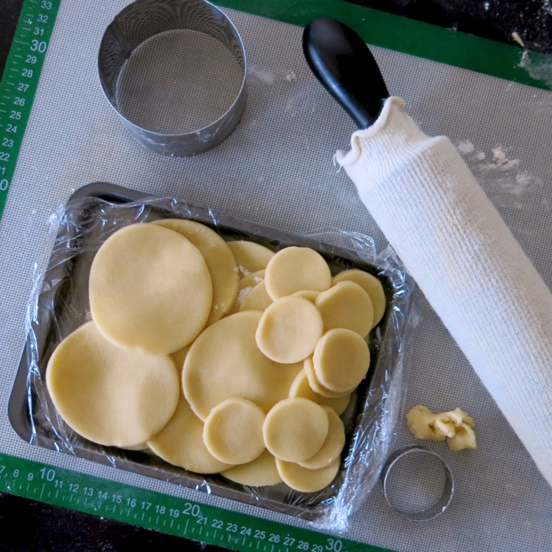 Above, left, are two molds that I used as cutters. The larger one is for the base pastry to go into the miniature tart ring mold. The smaller one is for its “lid”.