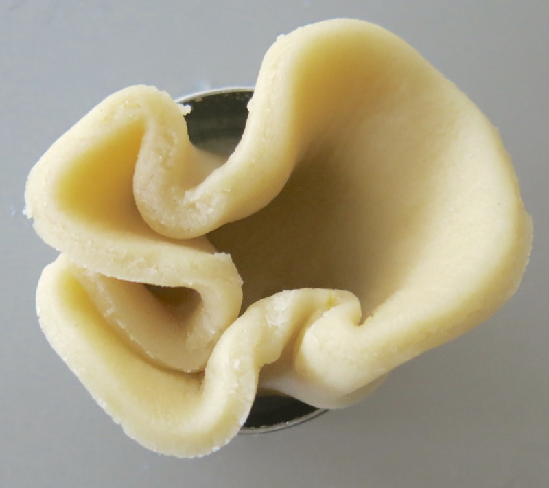 - Carefully and loosely "fold" each of the 24 larger discs of pastry dough vertically, like a napkin, and place the pointed part down into the miniature pastry ring, letting the pastry lean on the sides of the ring
