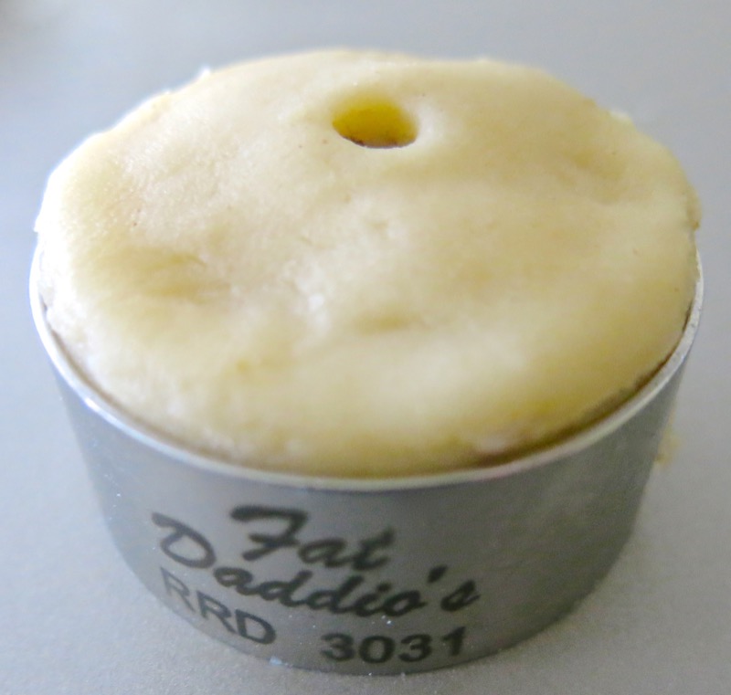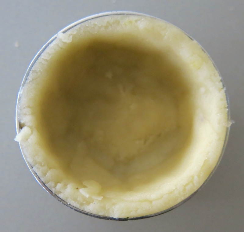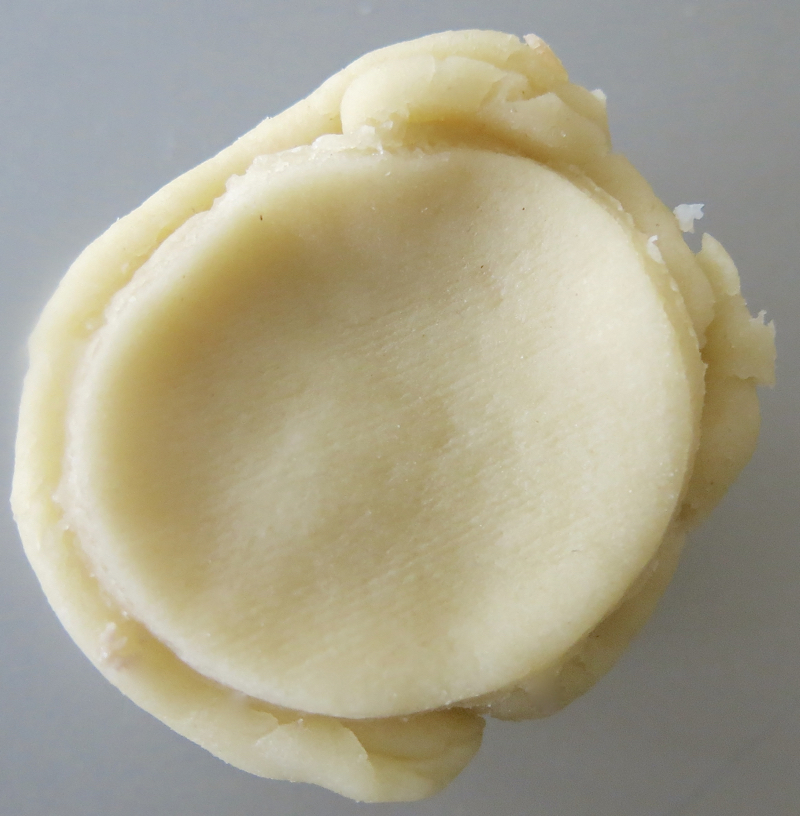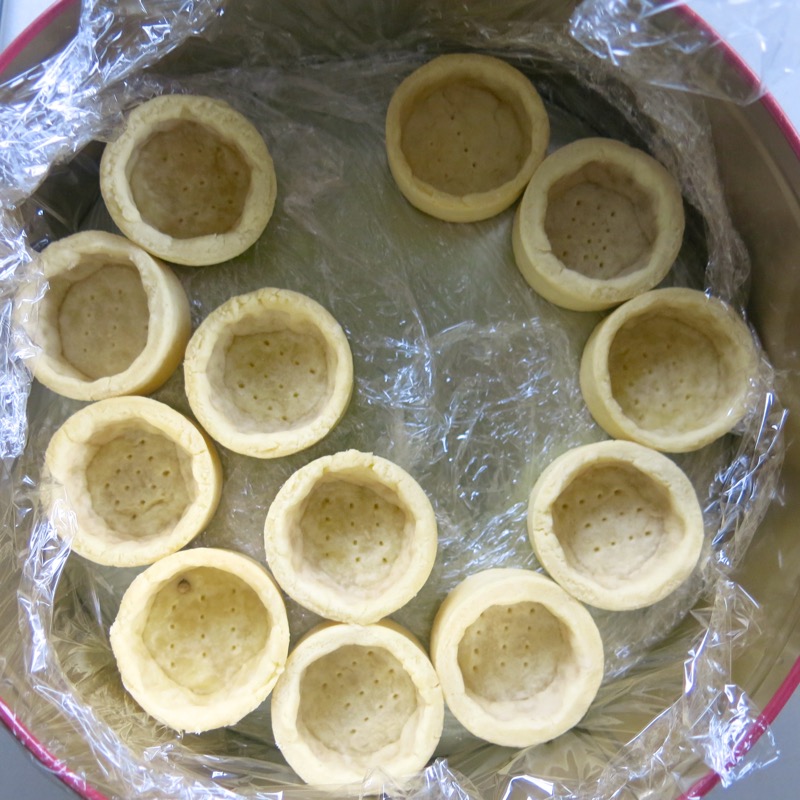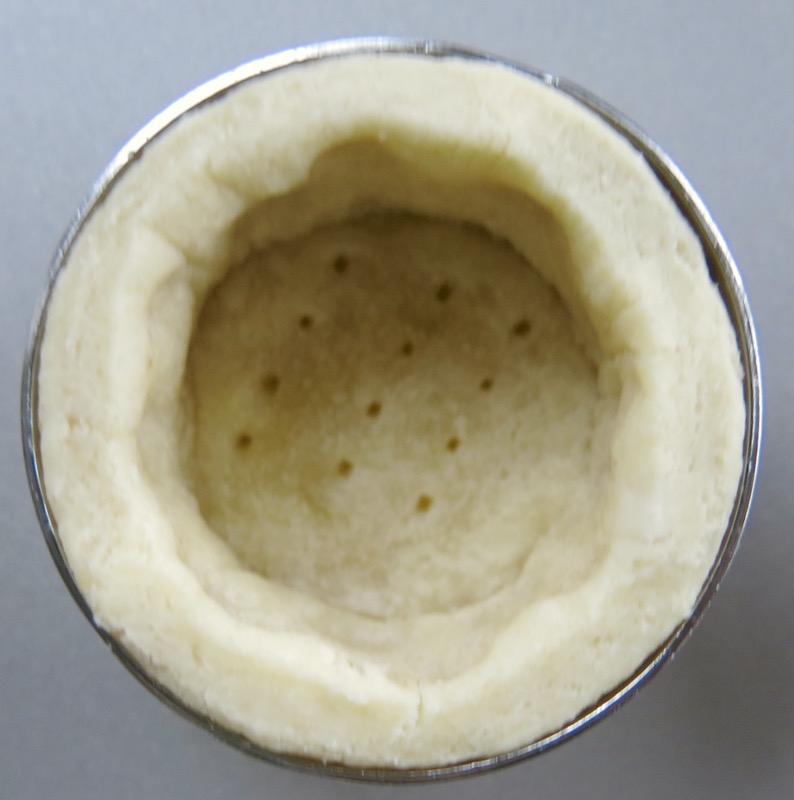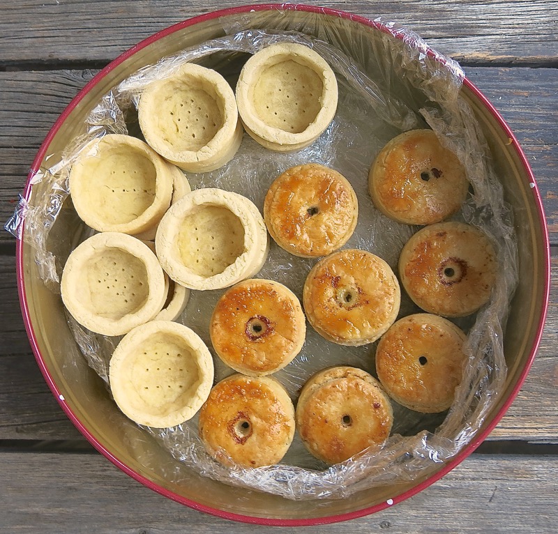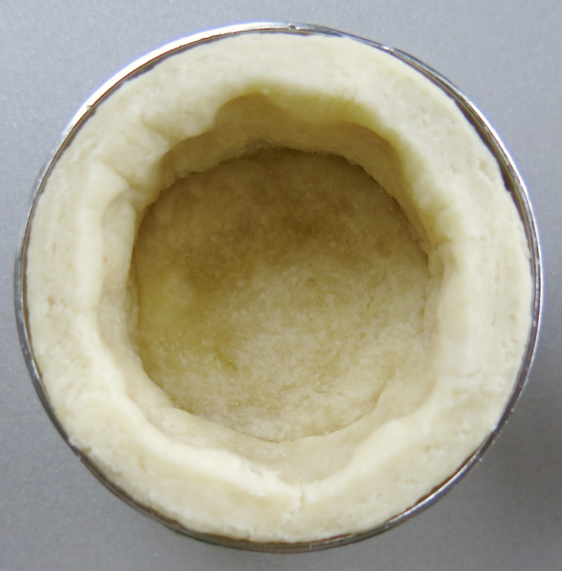 Take some time after you get the shape, to ensure the pastry dough is even bottom and sides. Mine is perfect as the sides do need to be a little on the thick side to remain stable once the ring is removed after baking and cooling. However, when making the covered pies, a much thinner pastry is better. The filling provides the substance for the release of the ring and the pie is more moist with more filling as the centre is so small.